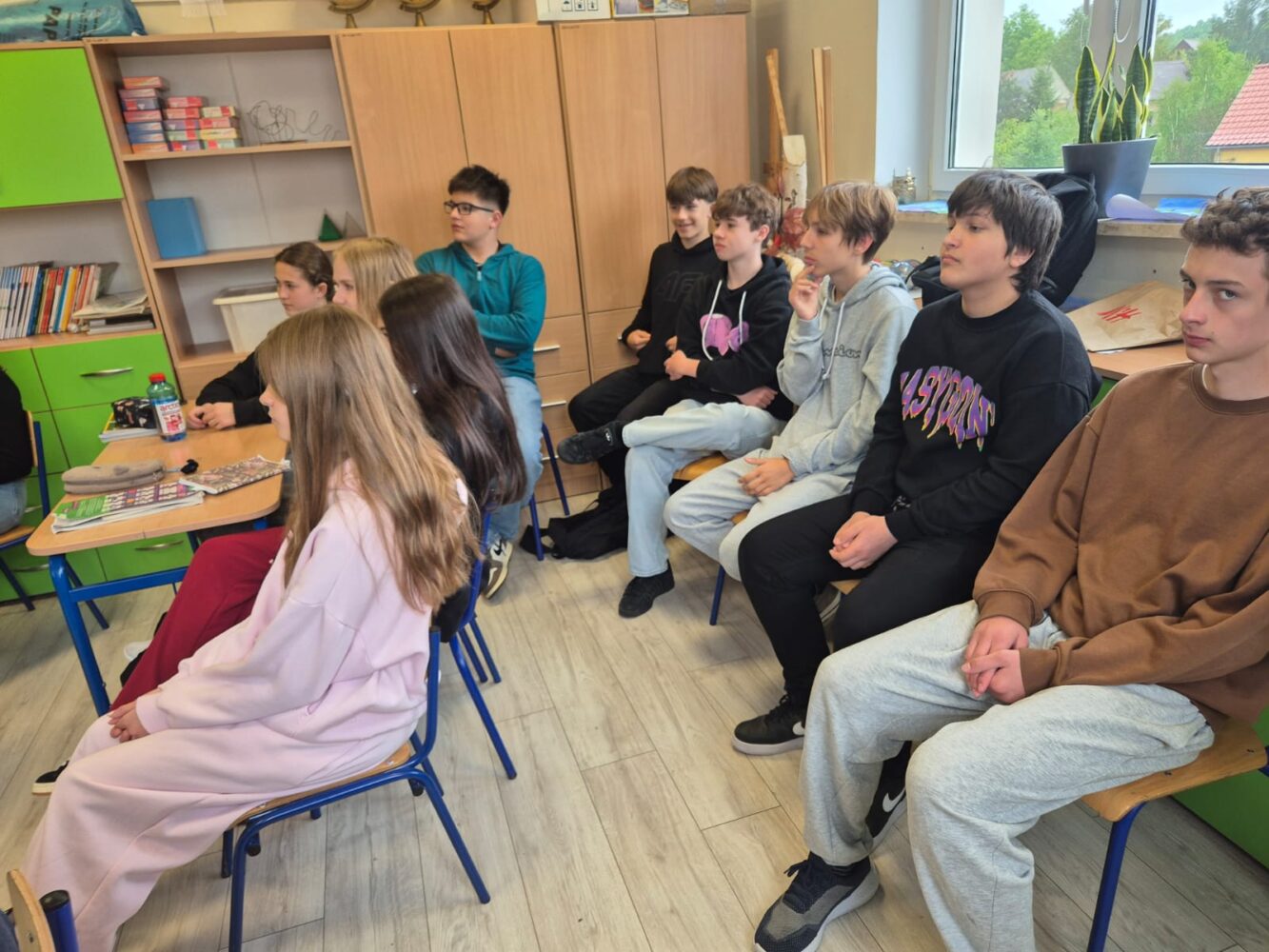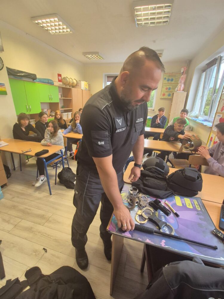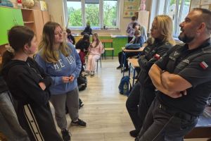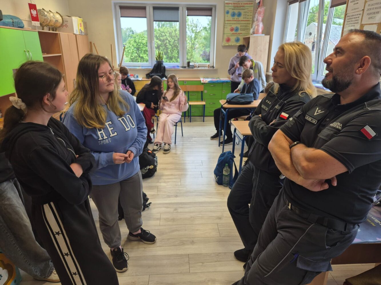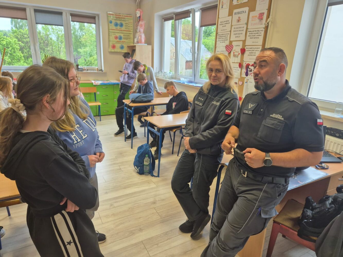 W dniu 19 maja na lekcji z doradztwa zawodowego w klasie VII i VIII, zorganizowanej przez pedagoga specjalnego A.Semeńczuk gościliśmy przedstawicieli Zakładu Karnego-Służby więziennej w Zarębie. Młodzież dowiedziała się jak funkcjonuje zakład karny. Zakład karny to nie tylko miejsce odbywania kary, której podstawową funkcją jest izolacja. To przede wszystkim resocjalizacja skazanych mająca na celu podjęcie zmian w obszarze funkcjonowania każdego osadzonego, który popełnia czyny karalne. Uczniowie uzyskali informacje o pracy w służbie więziennej. Dziękujemy naszym gościom za ciekawą lekcję.
