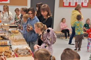 Już od wczesnych godzin porannych szkolny korytarz wypełnił się zapachem świeżo upieczonych babeczek, serników, szarlotek i innych słodkości. Stoły szybko zapełniły się kolorowymi wypiekami przygotowanymi przez uczniów i ich rodziny. Akcja cieszyła się ogromnym zainteresowaniem – kupowali zarówno uczniowie, jak i nauczyciele, pracownicy szkoły oraz mieszkańcy okolicznych wiosek.