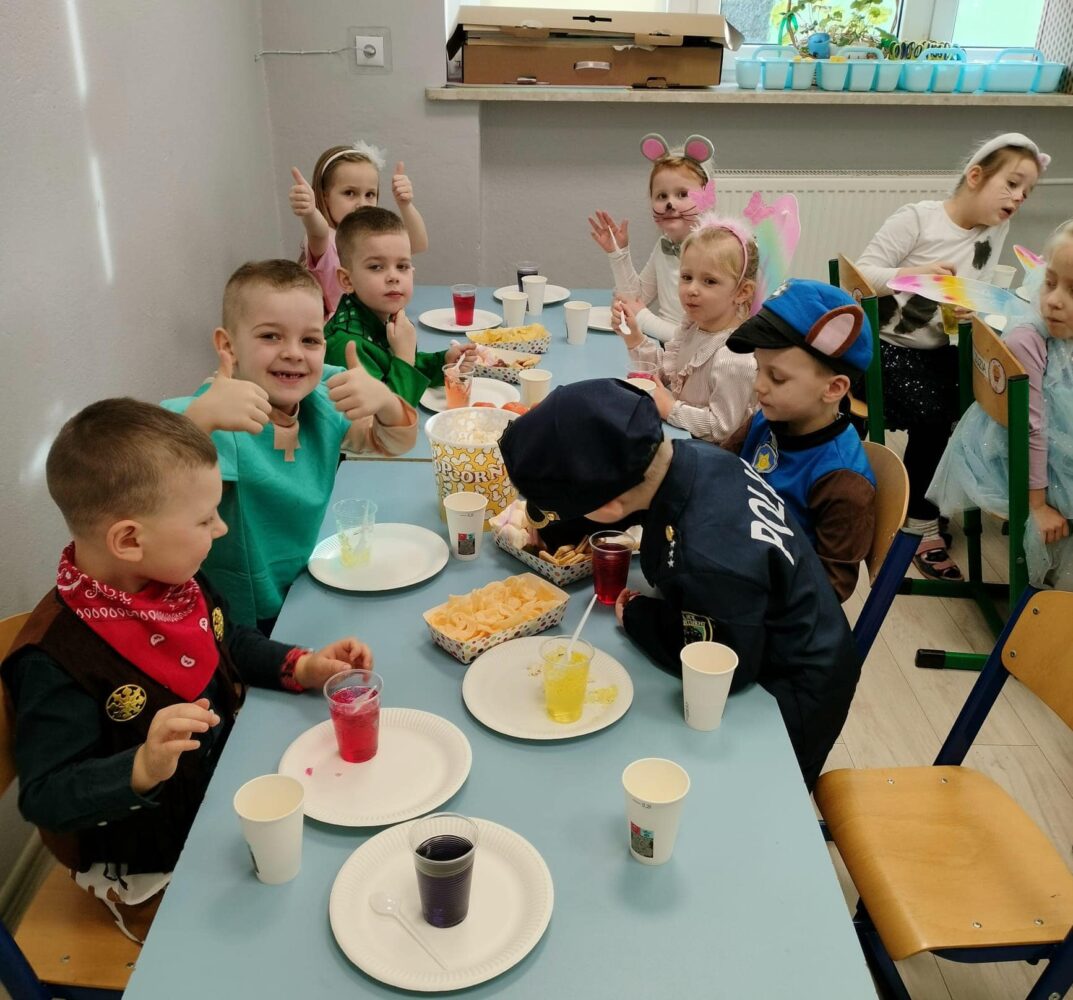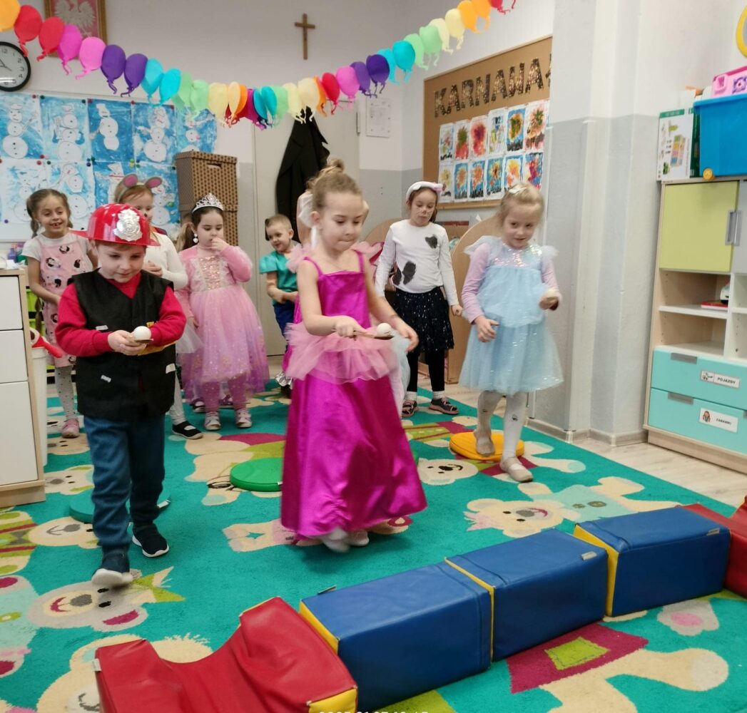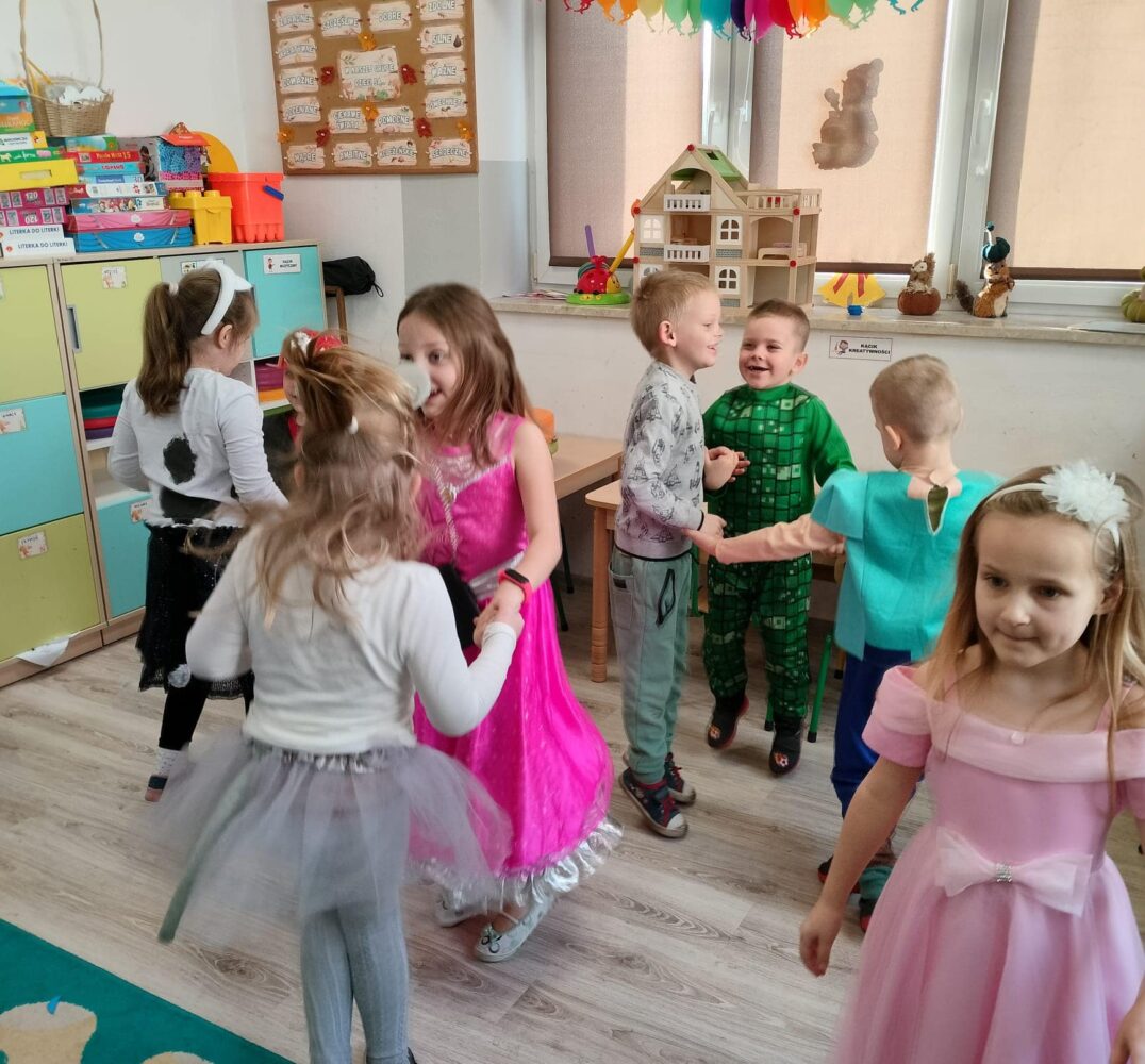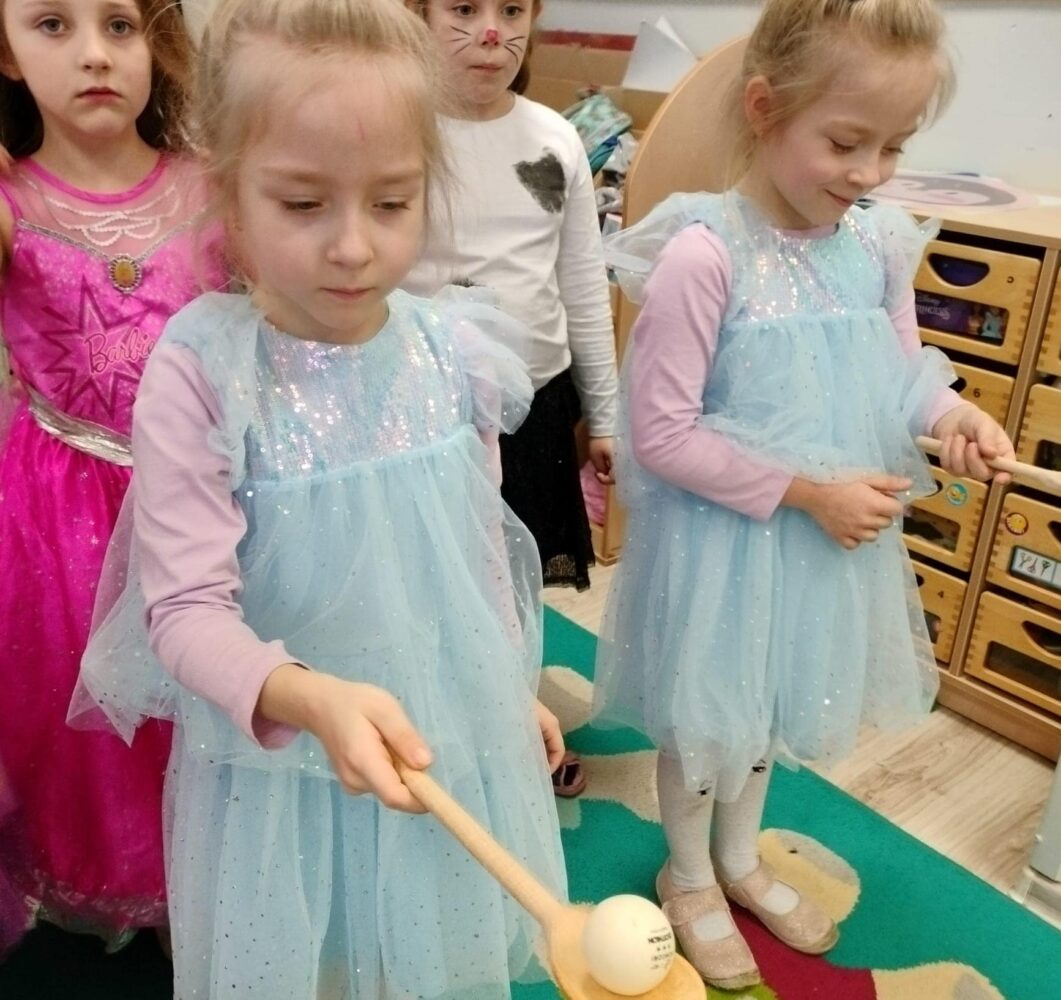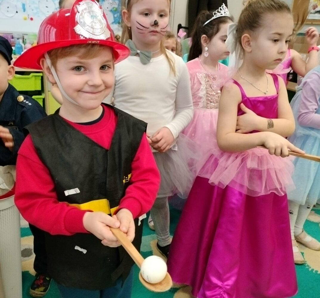 Wyścigi z łyżkami, „Kto ukrył się pod chustą?”, przechodzenie pod liną, wybór króla i królowej balu to tylko niektóre z atrakcji, które czekały na dzieci tego dnia. Rodzice zadbali o piękne przebrania oraz poczęstunek. Serdeczne podziękowania składamy mamie Michała oraz Jasia za pomoc przy poczęstunku.