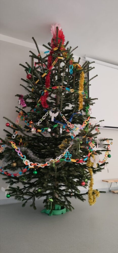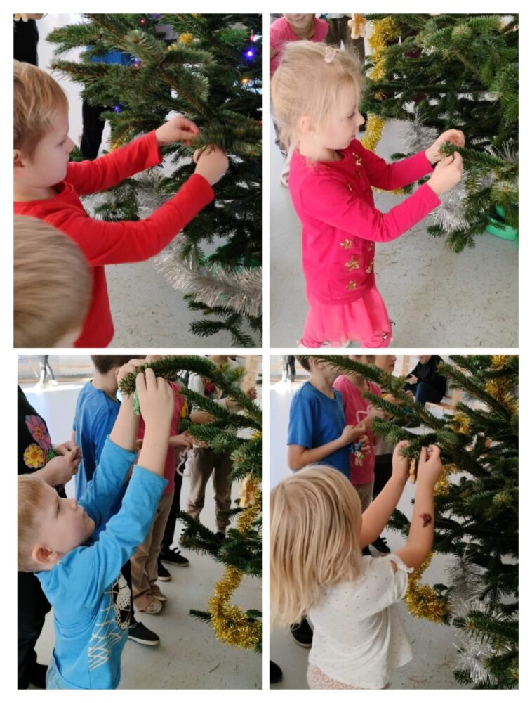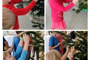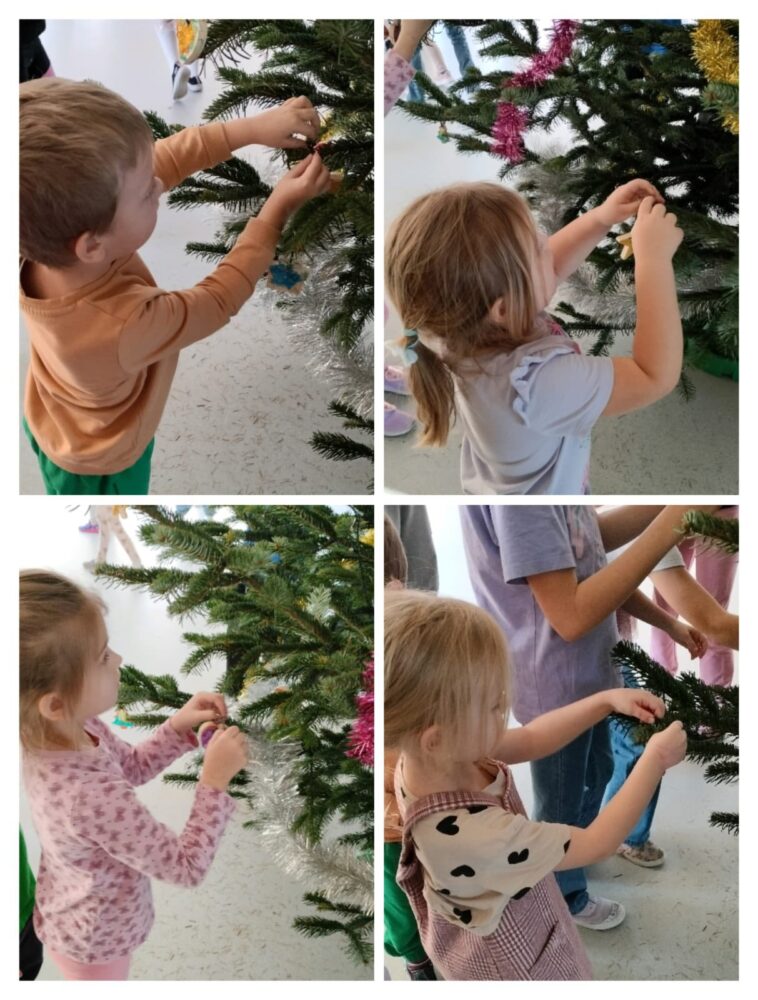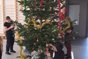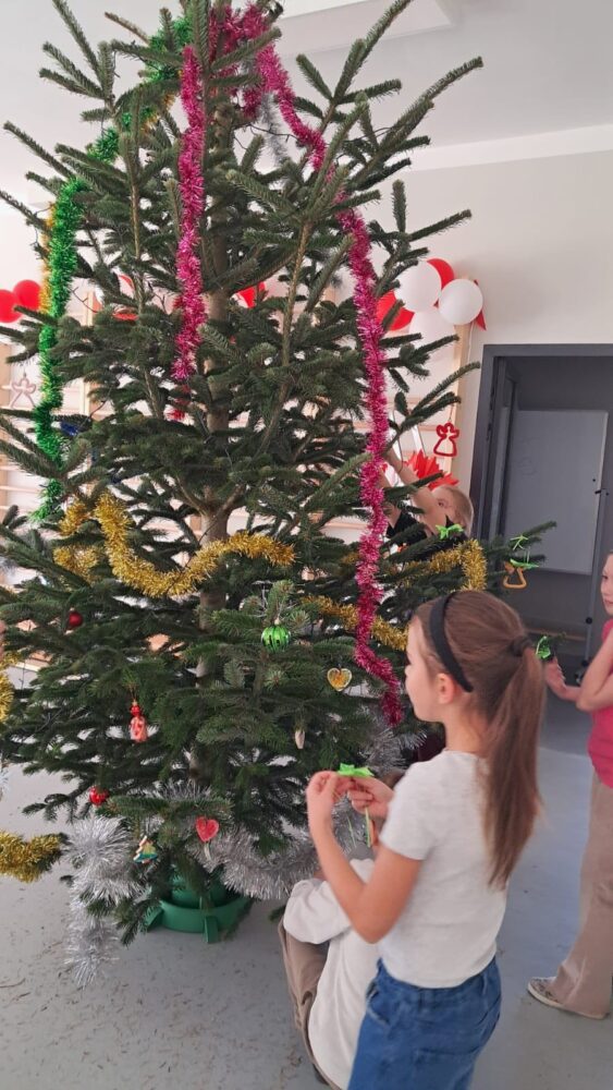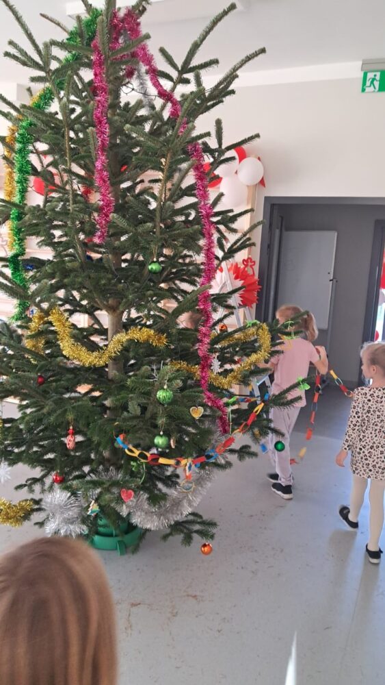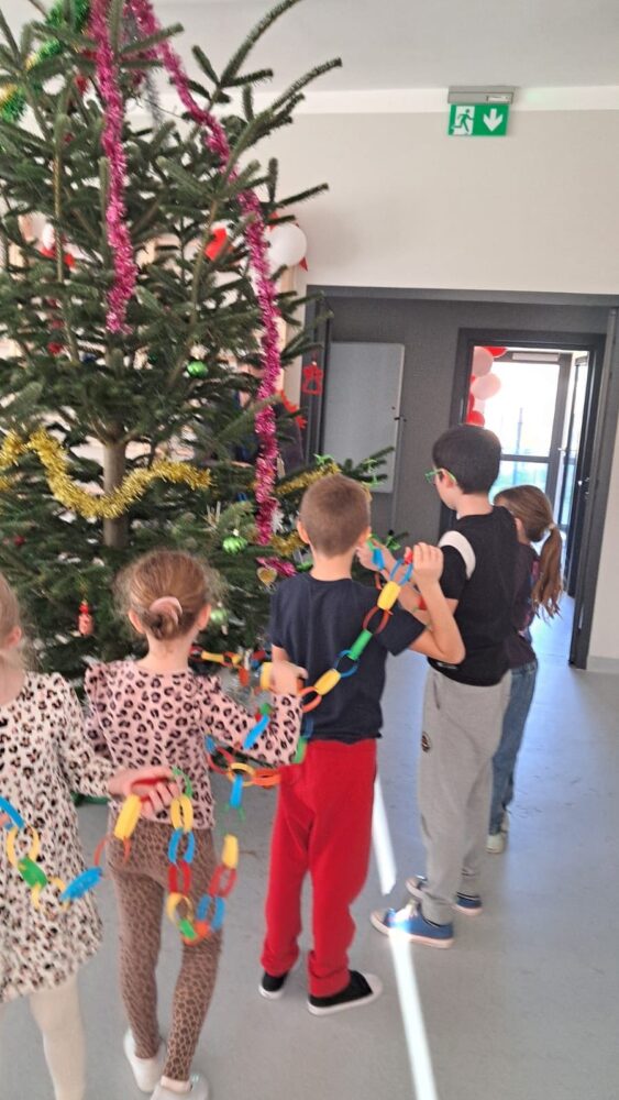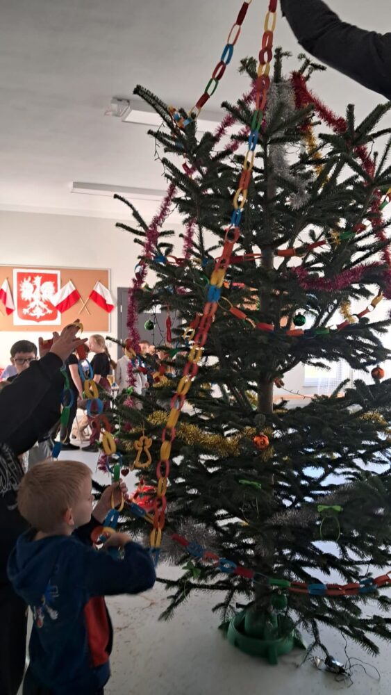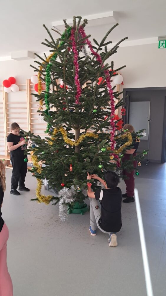 Klasy 1 – 3 oraz dzieci z oddziałów przedszkolnych z wychowawcami w dniu 12.12.2025r. udekorowali choinkę w naszym nowym holu. Dziękujemy dla rodziny Tosi i Klary za przywiezienie pięknego drzewka do naszej szkoły.