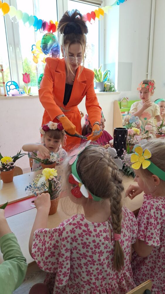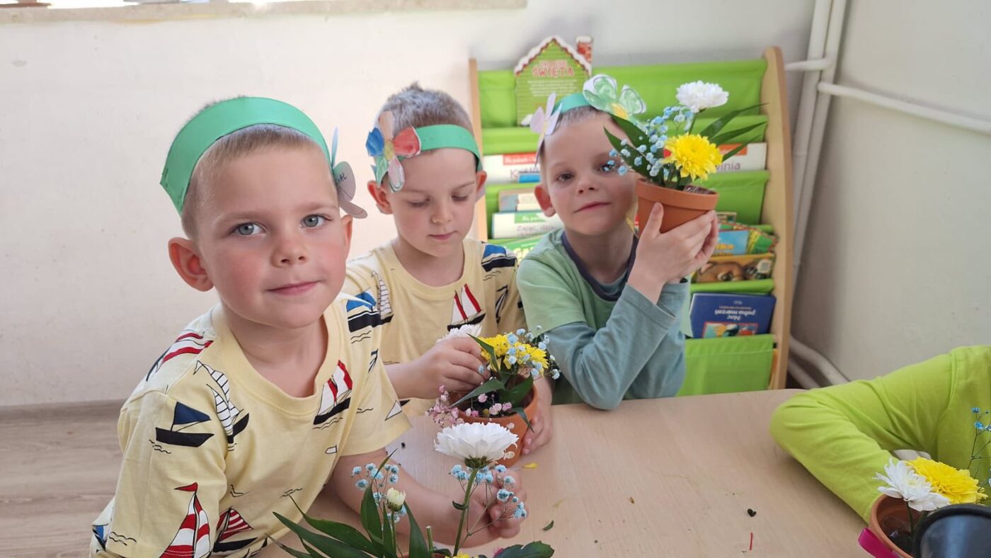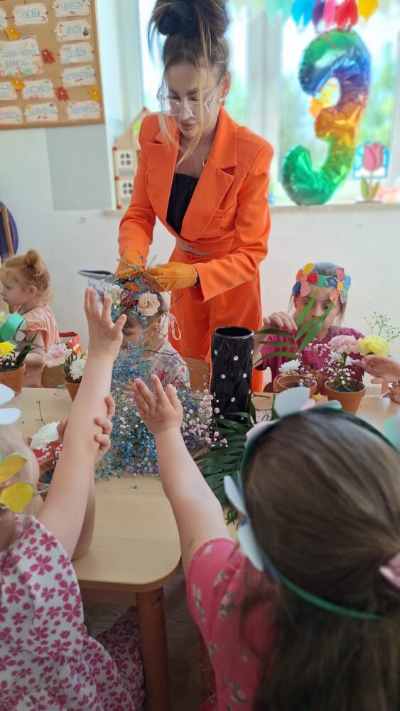Pod czujnym okiem mamy Letycji dzieci własnoręcznie wykonały piękne kwiatowe kompozycje.