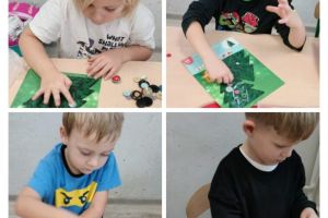 Przedszkolaki uczestniczyły w różnorodnych aktywnościach: tworzyły kolorowe obrazy z guzików, brały udział w zabawach sensorycznych i matematycznych, grały guzikami w grę zręcznościową „pchełki”, rozwijały motorykę małą poprzez nawlekanie oraz sortowanie guzików, z latarkami na głowach uczestniczyły w poszukiwaniach guzików, a nawet próbowały samodzielnie przyszyć guziki