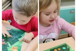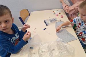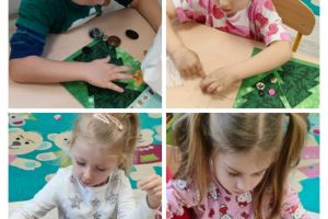 Przedszkolaki uczestniczyły w różnorodnych aktywnościach: tworzyły kolorowe obrazy z guzików, brały udział w zabawach sensorycznych i matematycznych, grały guzikami w grę zręcznościową „pchełki”, rozwijały motorykę małą poprzez nawlekanie oraz sortowanie guzików, z latarkami na głowach uczestniczyły w poszukiwaniach guzików, a nawet próbowały samodzielnie przyszyć guziki