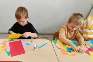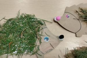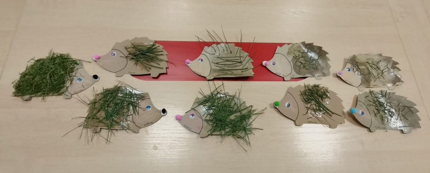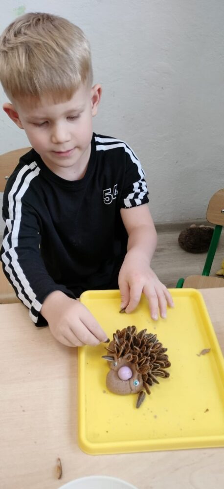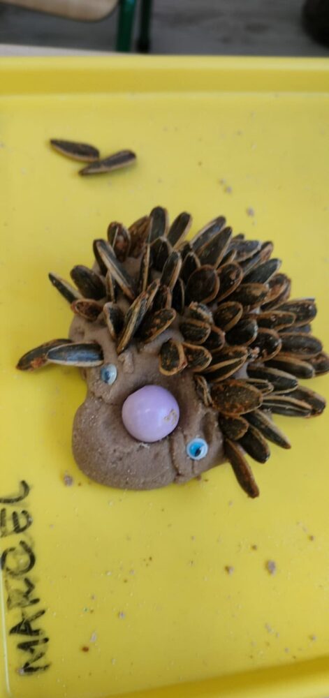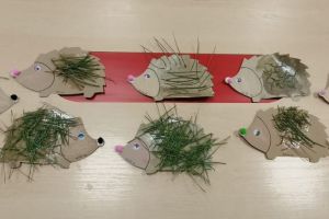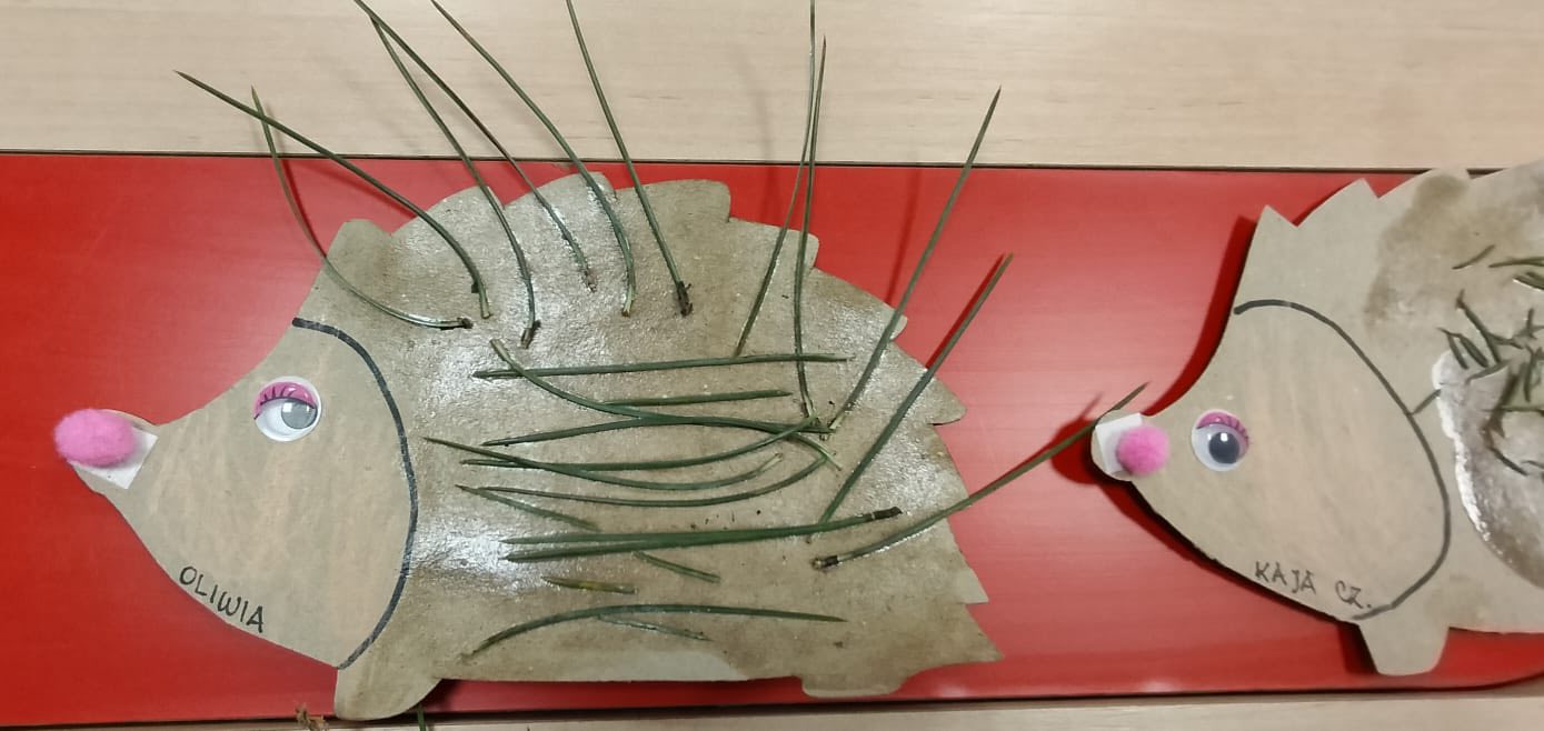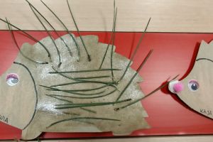 – prace plastyczne – dzieci tworzyły własne jeże z liści drzew iglastych, masy solnej i ziaren słonecznika oraz kolorowego papieru;