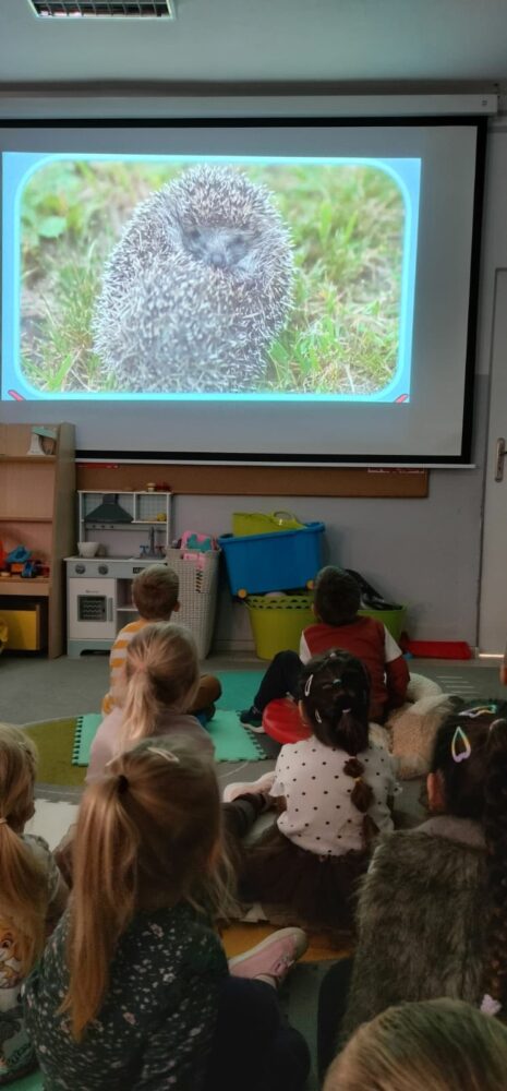Zajęcia rozpoczęły się od krótkiej prezentacji o życiu jeży. Dzieci dowiedziały się, gdzie mieszkają te sympatyczne zwierzątka, czym się żywią, jak przygotowują się do zimy oraz dlaczego są objęte ochroną. Rozmowa była okazją, by poruszyć ważne tematy związane z troską o przyrodę i odpowiedzialnym zachowaniem człowieka wobec zwierząt.