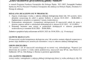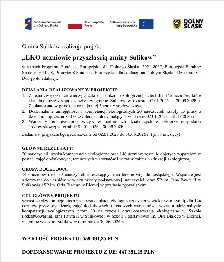 „EKO uczniowie przyszłością gminy Sulików” w ramach Programu Fundusze Europejskie dla Dolnego Śląska 2021-2027, Europejski Fundusz Społeczny PLUS, Priorytet 8 Fundusze Europejskie dla edukacji na Dolnym Śląsku, Działanie 8.1 Dostęp do edukacji.