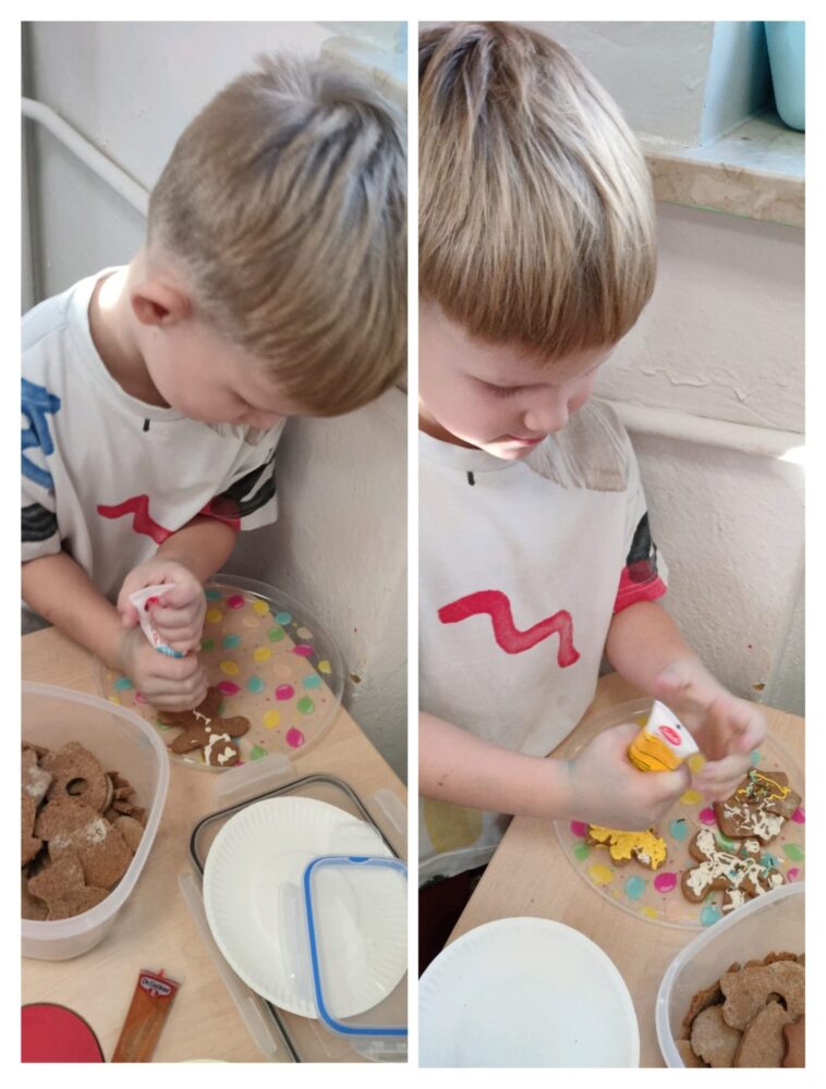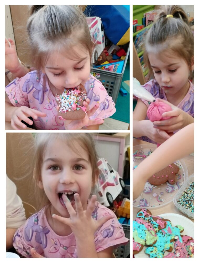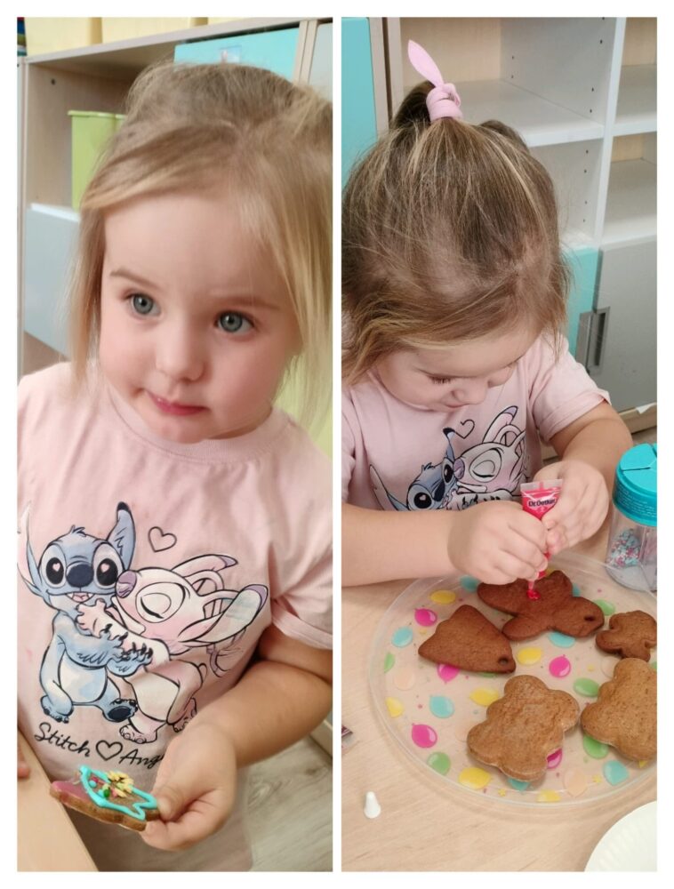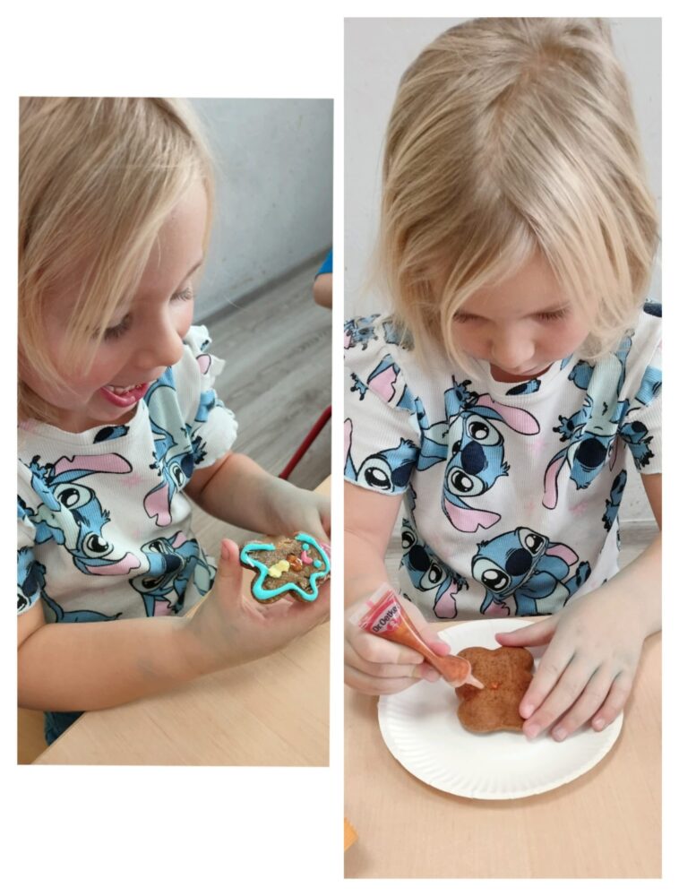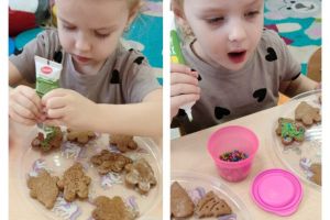 W naszych grupach przedszkolnych zrobiło się ostatnio wyjątkowo słodko i pachnąco! To pełne radości i twórczej zabawy spotkanie wprowadziło dzieci w magiczny, świąteczny nastrój. Dzieci z ogromnym zaangażowaniem dekorowały pierniczki kolorowymi lukrami oraz posypkami.