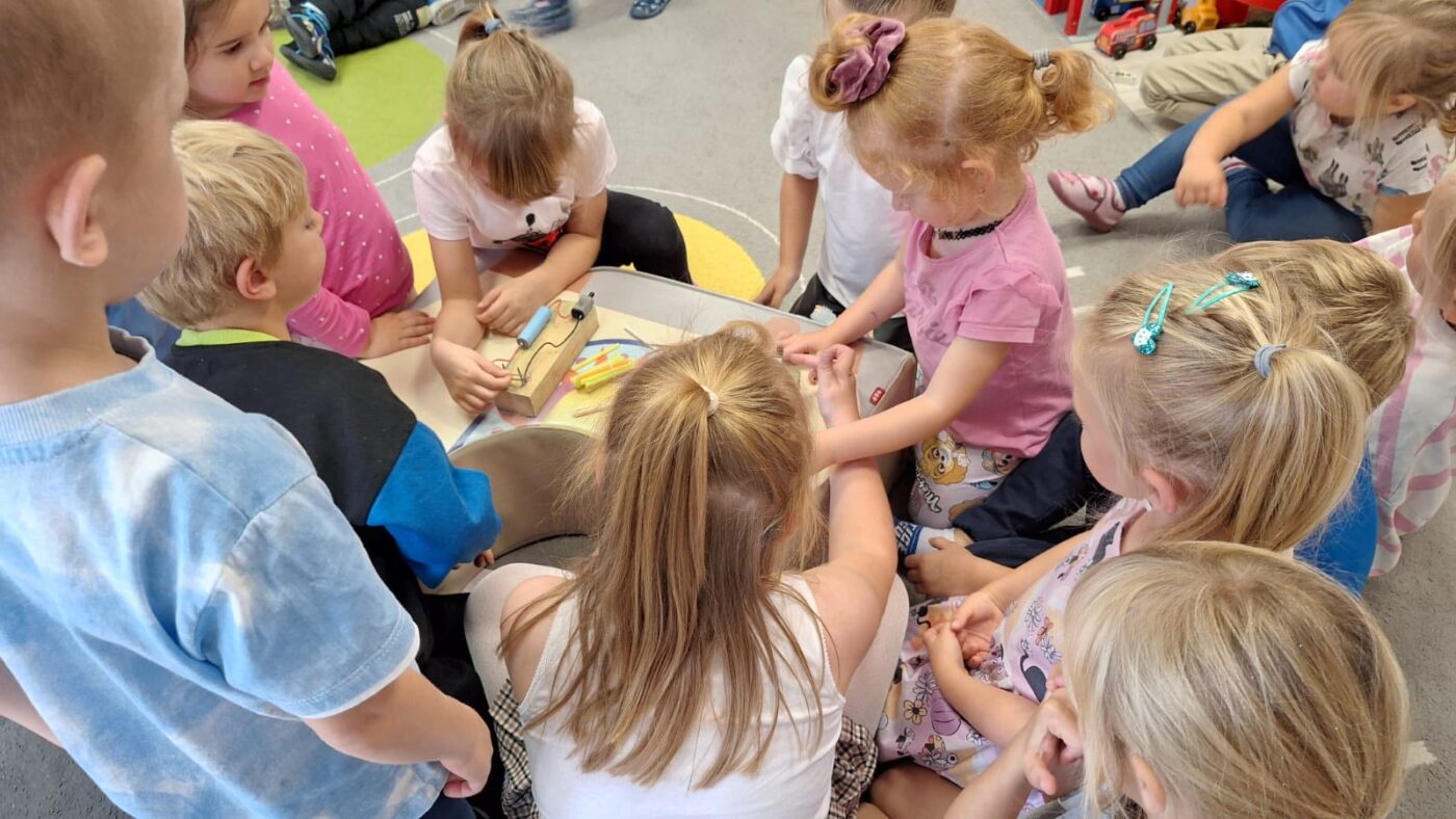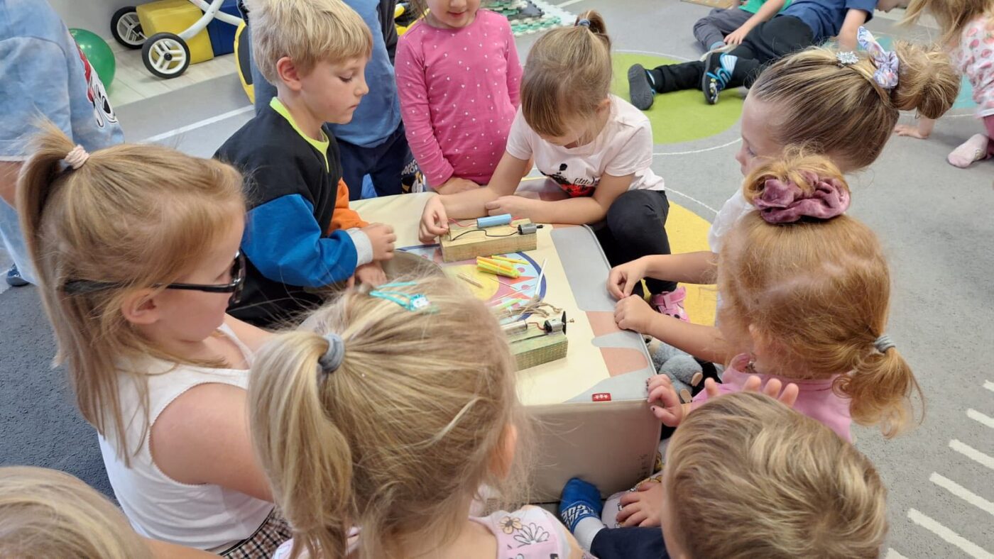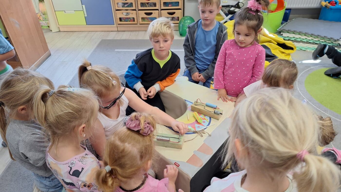 Dzisiaj przedszkolaki odwiedziła ”Pani Profesor fizyki”, która przeprowadziła ”profesjonalne” zajęcia na temat materiałów przewodzących prąd. Dziękujemy serdecznie młodej naukowczyni oraz jej ”zespołowi badawczemu”
