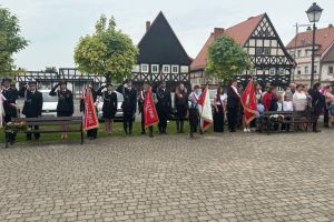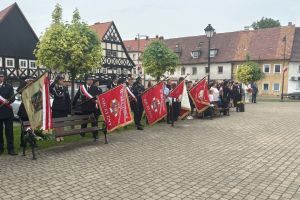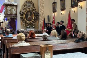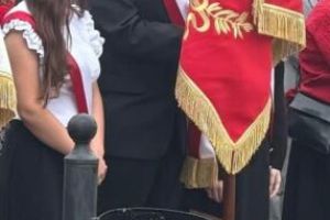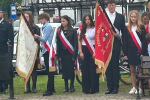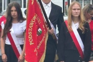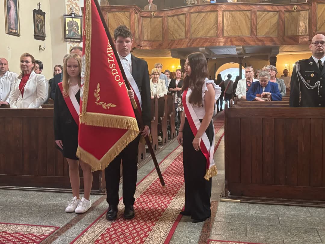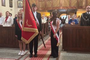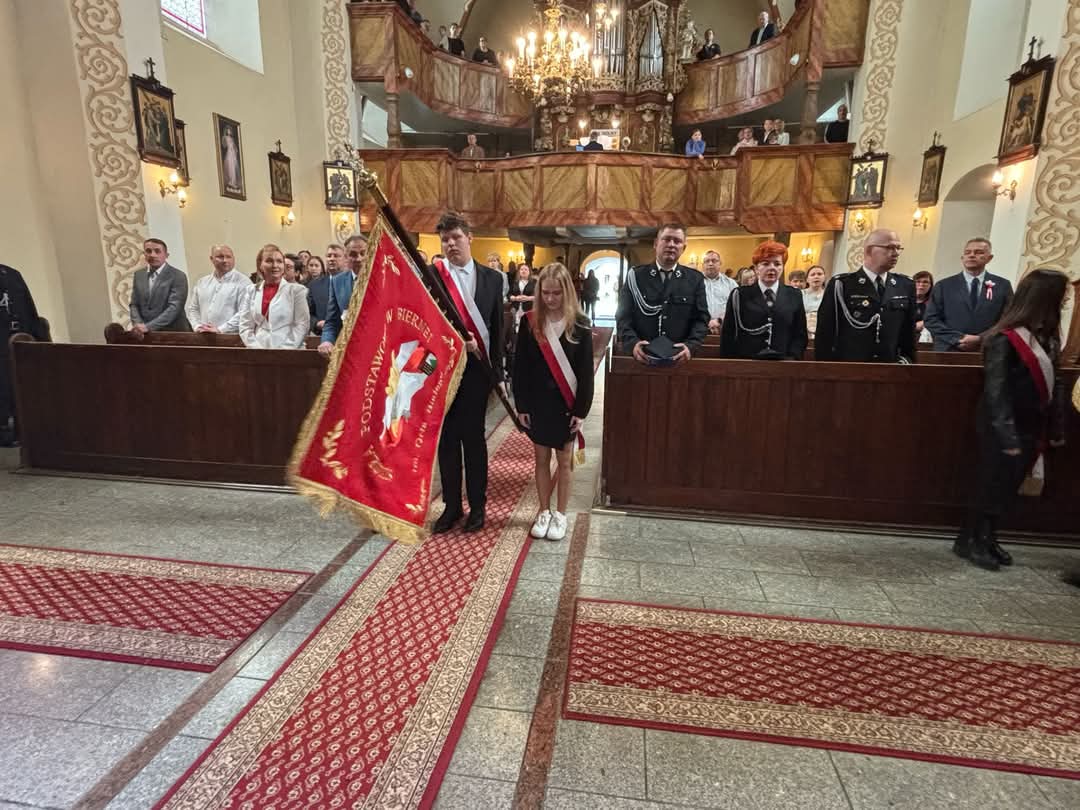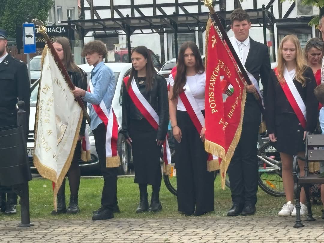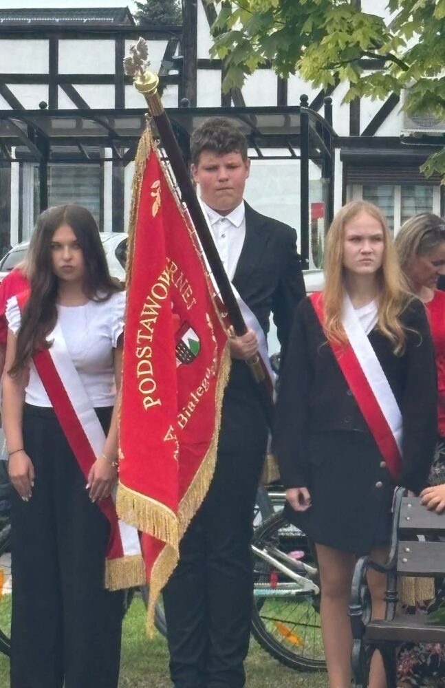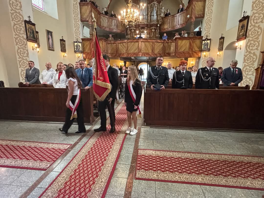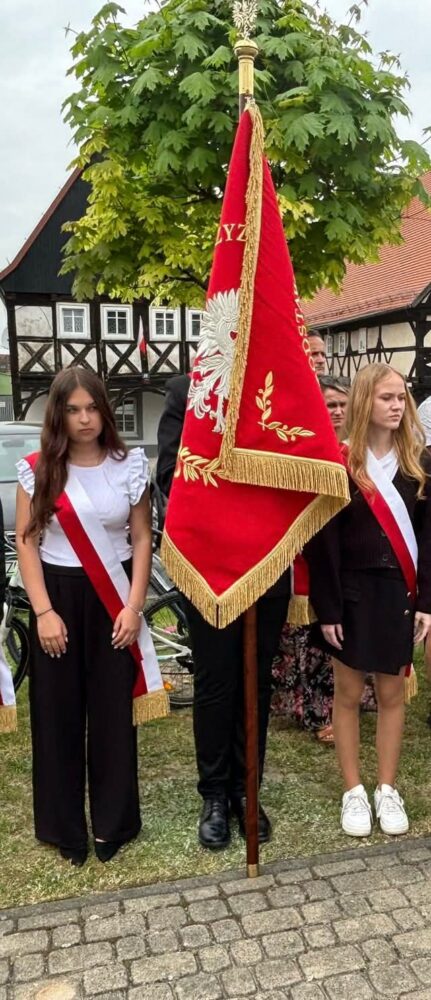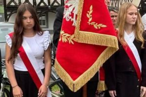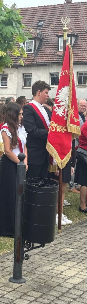 Nasza delegacja, poczet sztandarowy (Hanna, Julia, Sebastian) ze sztandarem oraz biało czerwona wiązanka kwiatów podczas gminnej uroczystości 234 rocznicy uchwalenia Konstytucji Trzeciego Maja w Sulikowie.