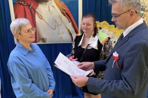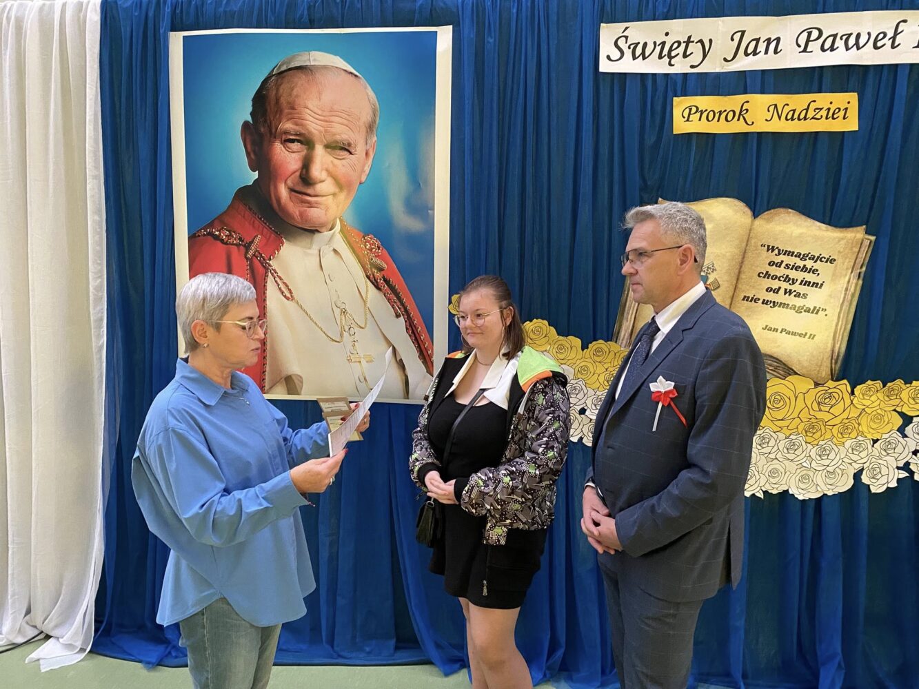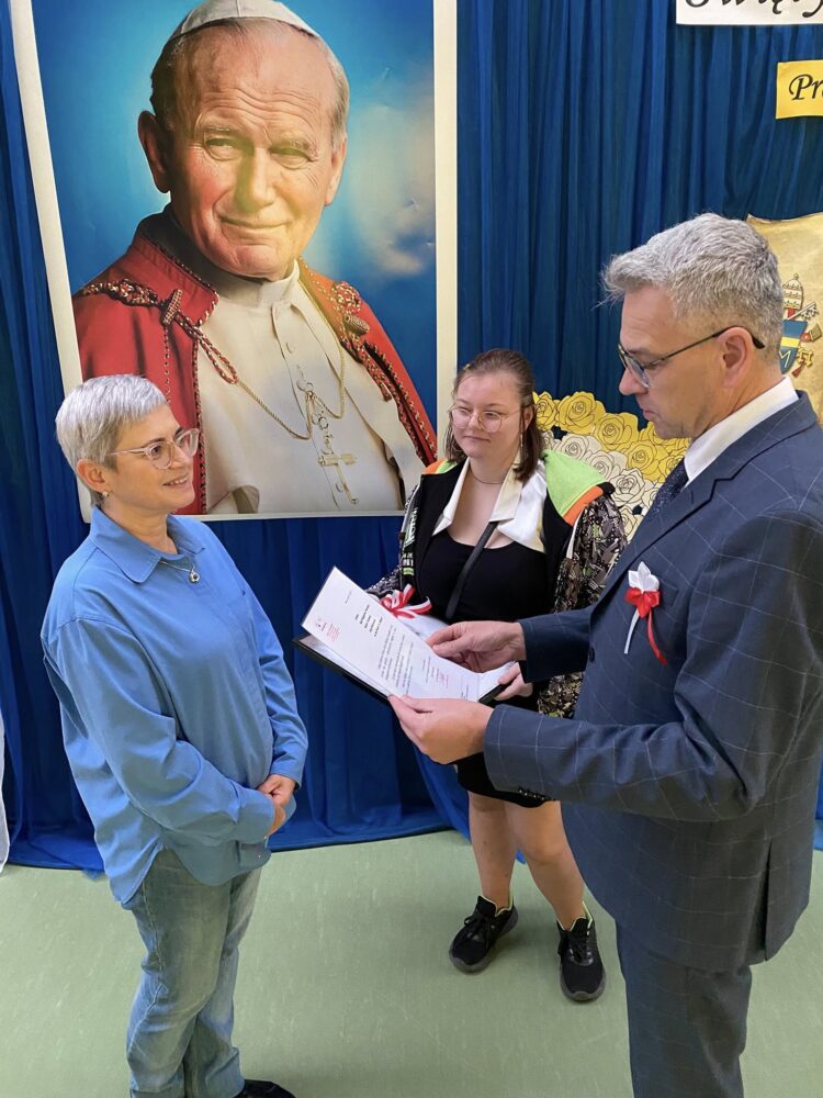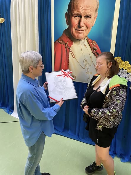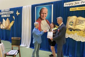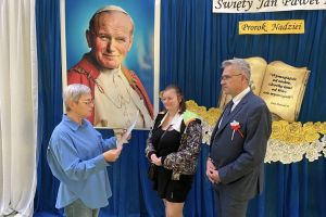 W dniu 7 listopada Dyrektor SP im. Orła Białego w Biernej oraz Nikola Rychter uczennica klasy 8 przekazali dyplom uznania oraz obraz patrona szkoły św. Jana Pawła II na ręce Pani Anny Poniedziałek Dyrektora Szkoły Podstawowej im. Jana Pawła II z okazji jubileuszu 80 lecia tej placówki.