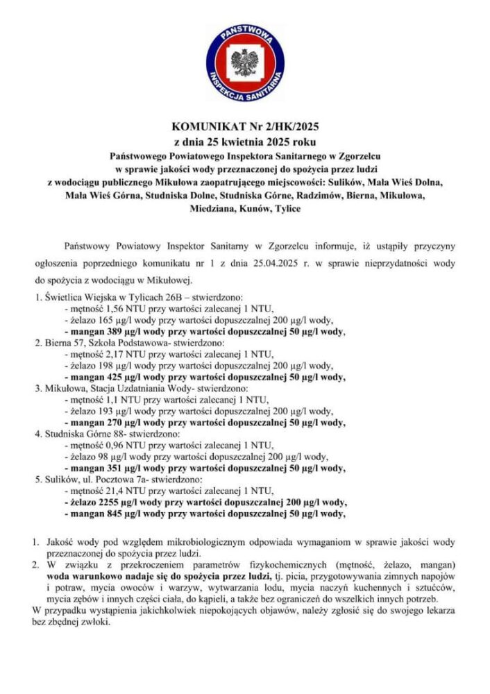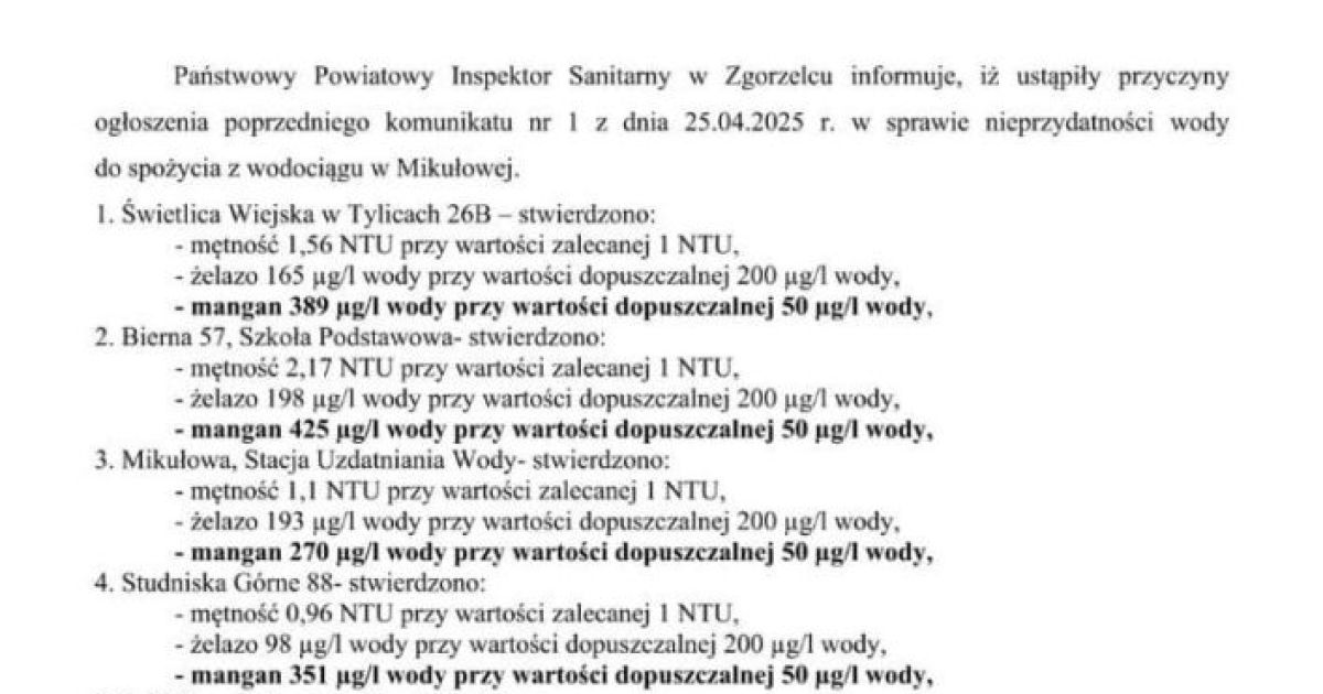 Pa艅stwowy Powiatowy Inspektor Sanitarny w Zgorzelcu publikuje kolejny komunikat dotycz膮cy spe艂nienia wymaga艅 rozporz膮dzenia Ministra Zdrowia z dnia 7 grudnia 2017 r. w sprawie jako艣ci wody przeznaczonej do spo偶ycia przez ludzi (Dz. U. z 2017 r. poz. 2294).