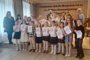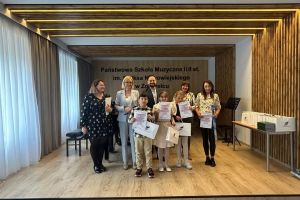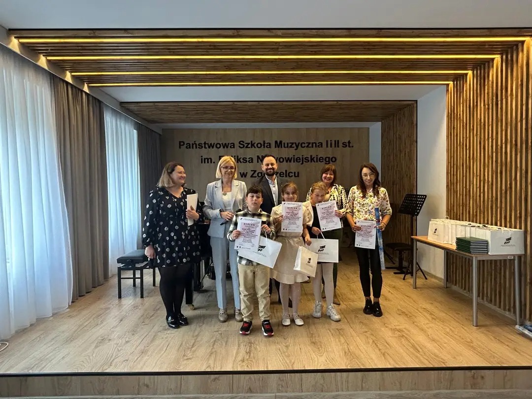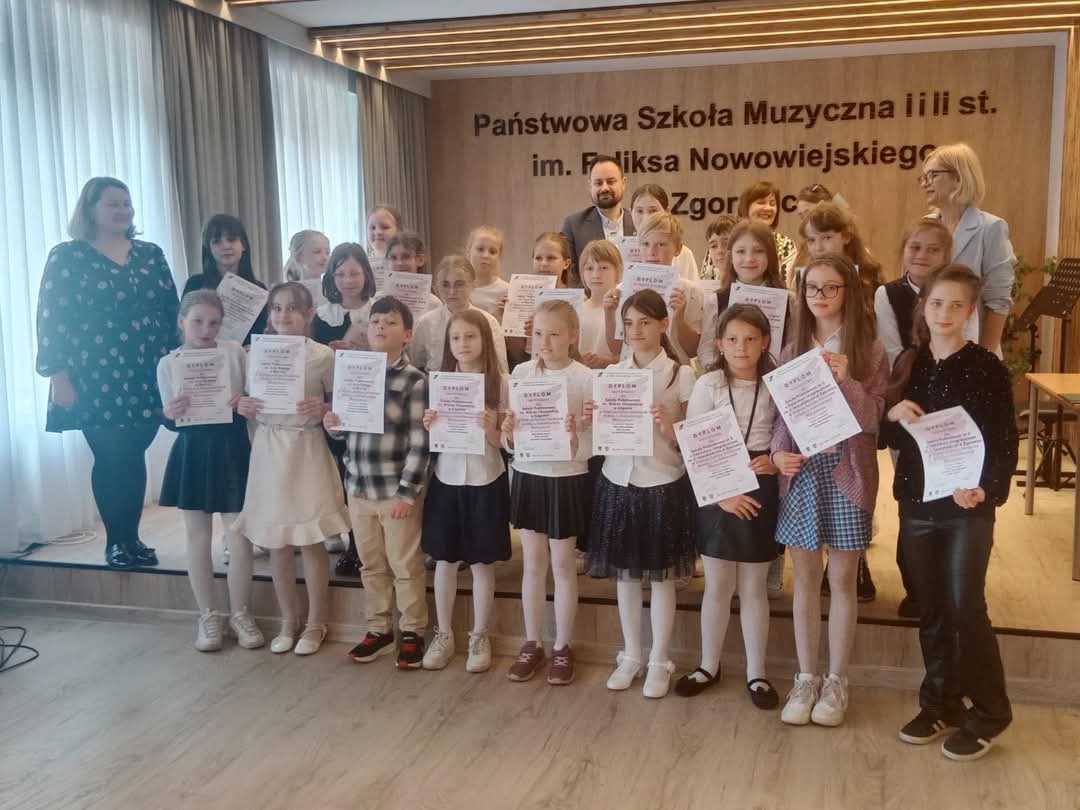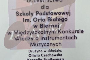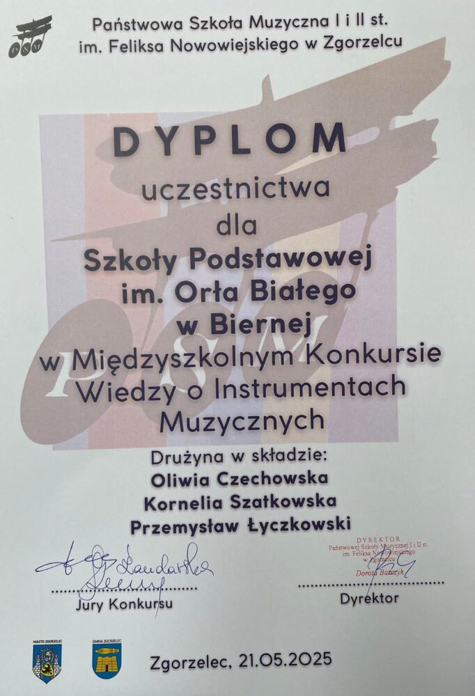 Nasi uczniowie klasy III: Oliwia Czechowska, Kornelia Szatkowska i Przemysław Łyczkowski wzięli udział w „Konkursie wiedzy o instrumentach muzycznych”, który odbył 21 maja 2025r. w Państwowej Szkole Muzycznej I i II stopnia im. Feliksa Nowowiejskiego w Zgorzelcu.