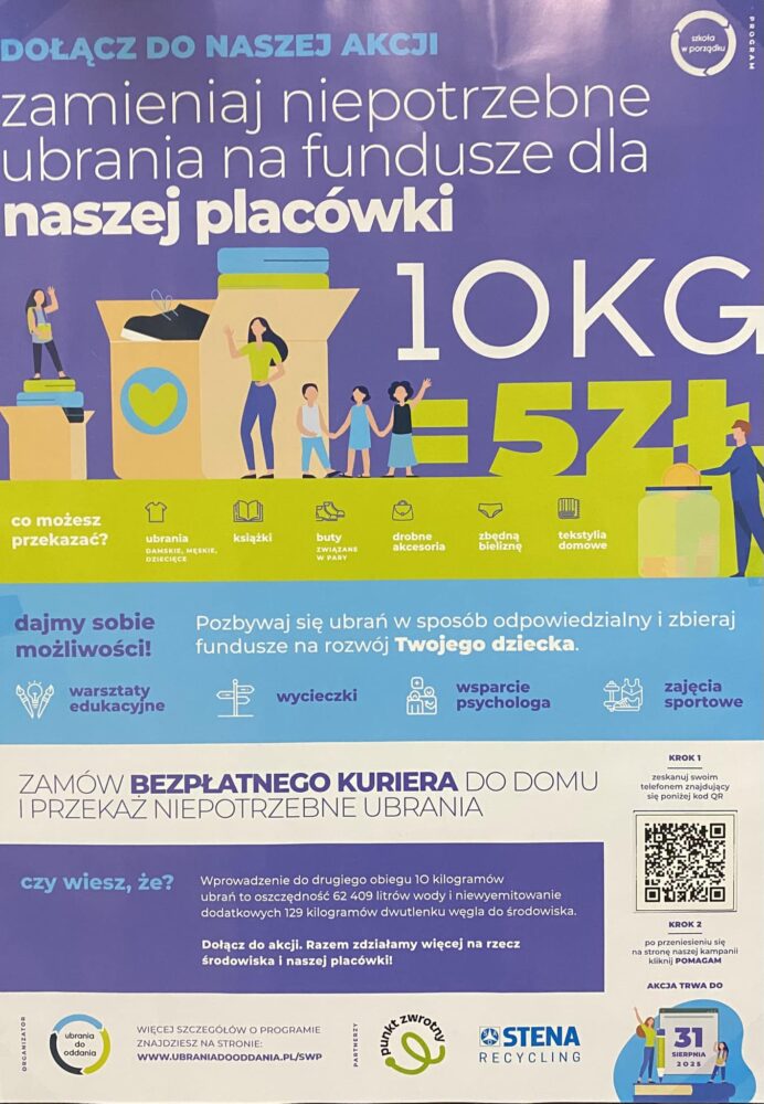 29 stycznia – czekamy na Wasze pudełka od 10 do 25 kg z ubraniami, butami, poszewkami, książkami itp. w dobrym stanie. Akcja „UBRANIA DO ODDANIA” Szkoła w Porządku to pomysł EKO-logiczny i EKO-nomiczny