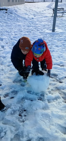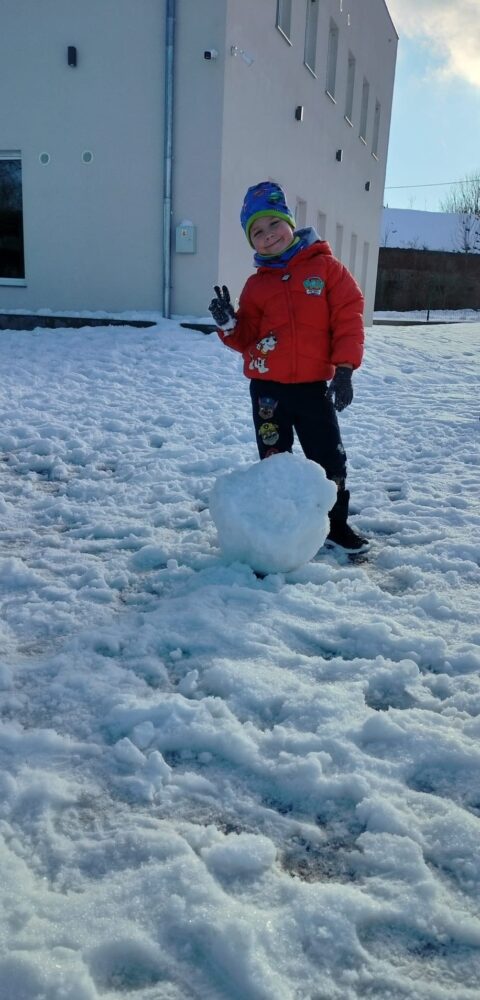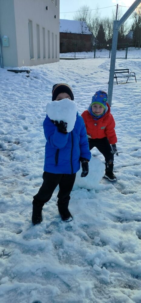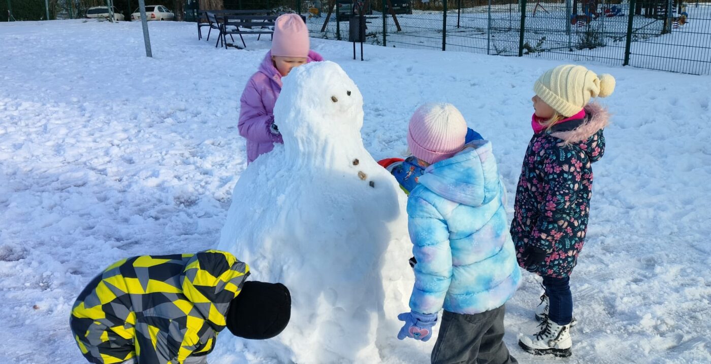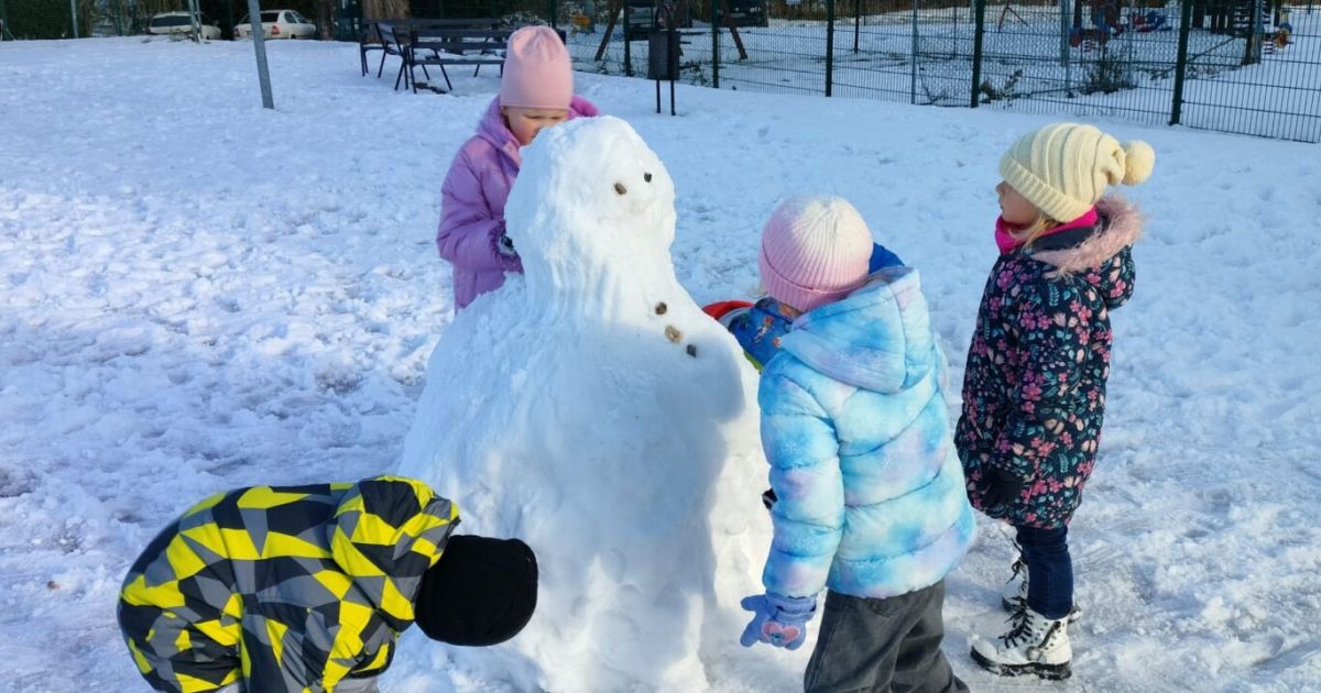 Pierwszy śnieg zawsze budzi w dzieciach ogromną radość i ciekawość. Gdy tylko biały puch pojawił się na szkolnym boisku, nasze przedszkolaki z entuzjazmem wybiegły na zewnątrz, by wspólnie odkrywać uroki zimy. Dla wielu z nich był to pierwszy w tym roku kontakt z miękkim, skrzącym się śniegiem — nic więc dziwnego, że uśmiechy nie schodziły im z twarzy.