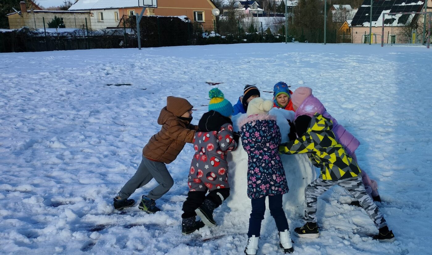 Już po chwili na boisku dało się zauważyć pierwsze próby lepienia śnieżek, które szybko przerodziły się w wesołe zabawy ruchowe. Dzieci zbudowały także bałwana oraz rysowały na białej powierzchni różnorodne wzory. Wspólna praca nad śniegową budowlą uczyła je współdziałania, planowania i dzielenia się zadaniami.