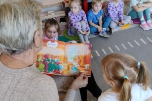 W środę 27 listopada w oddziałach przedszkolnych odbyło się pierwsze spotkanie czytelnicze. Zaproszony gość zaproponował przedszkolakom m.in. klasyki literatury dziecięcej, takie jak „Trzy świnki” czy „Kopciuszek”, które bardzo podobały się dzieciom. Serdecznie dziękujemy Babci Milenki za miłą atmosferę, poświęcony czas oraz propagowanie czytelnictwa wśród najmłodszych.