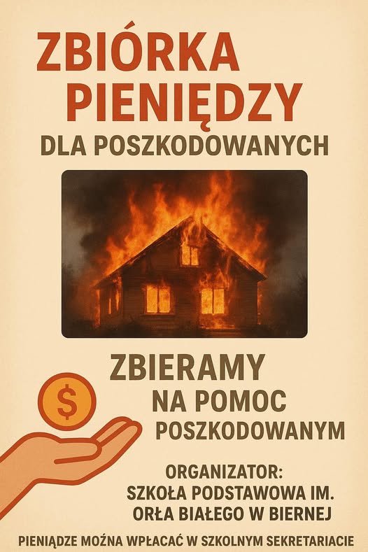 Zebrane środki ze sprzedaży w całości przekażemy dla rodziców naszego ucznia, którzy stracili cały dobytek w pożarze.