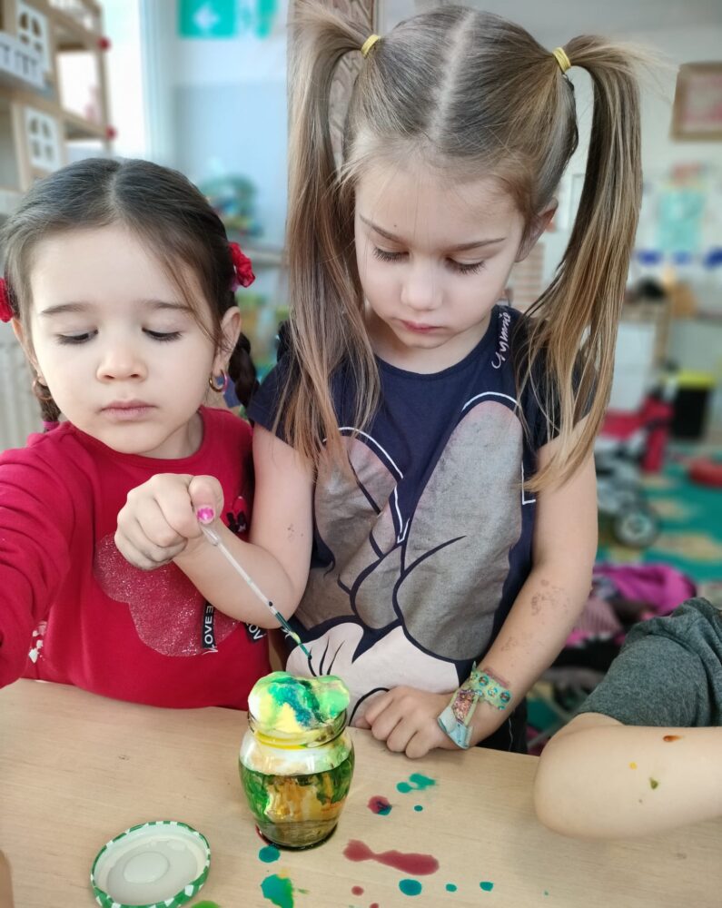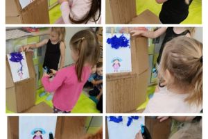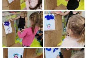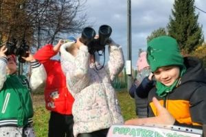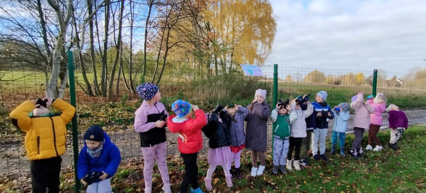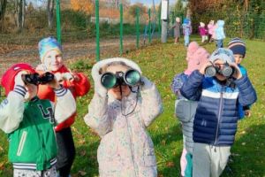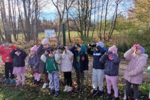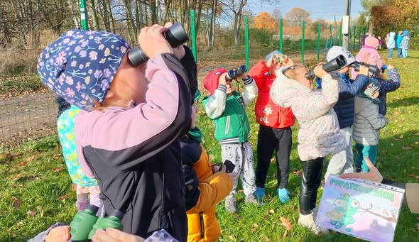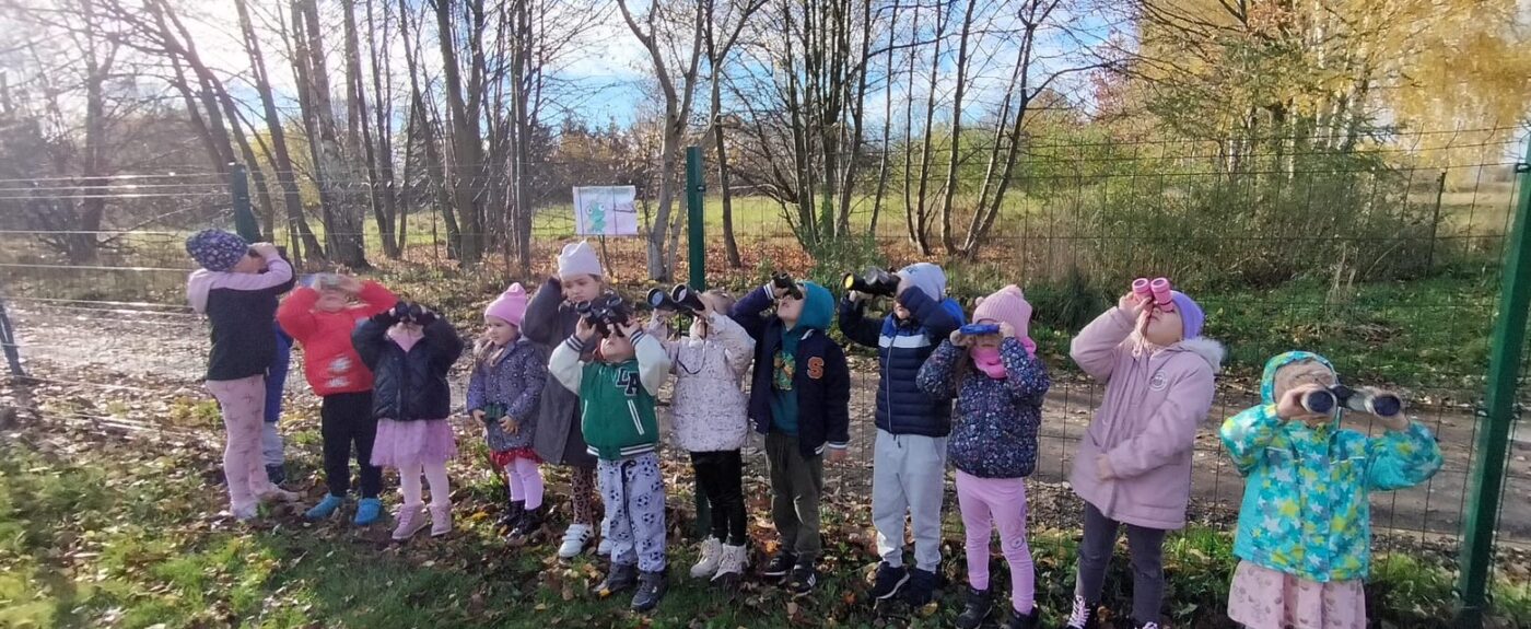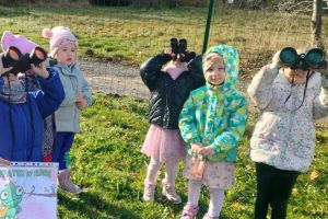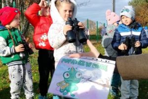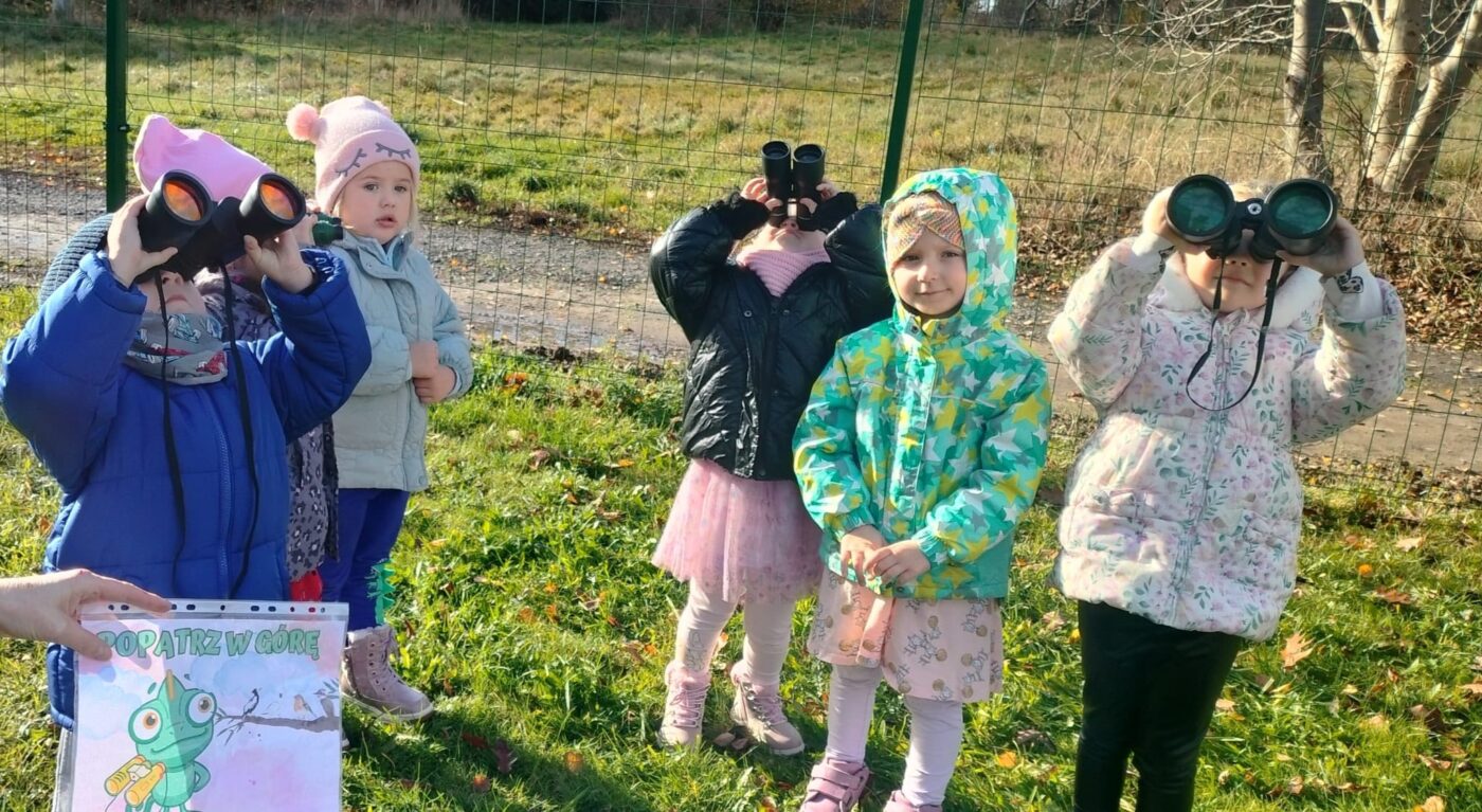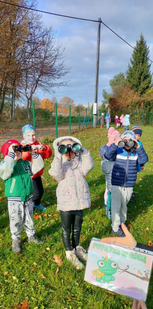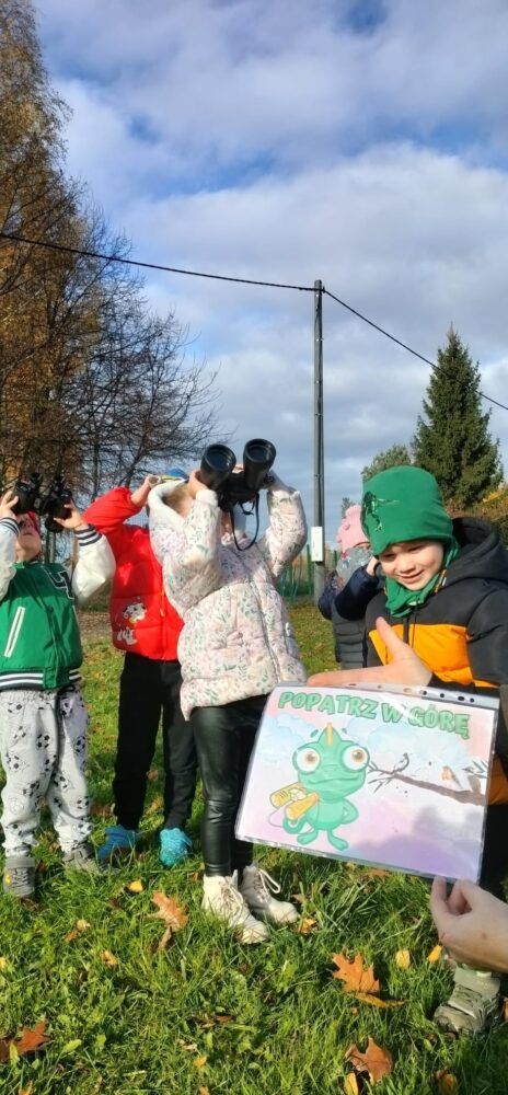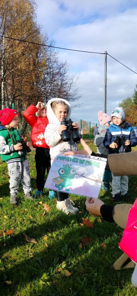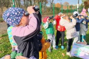 Zrealizowały w ten sposób zadanie projektu „Małe rączki-wielkie możliwości czyli sensoryczna droga do sprawności” pt. „Deszczowe chmury”, a chwytając w dłoń lornetki i prowadząc obserwacje na świeżym powietrzu- zadanie z projektu „Kameleon” pod hasłem „Popatrz w górę”.