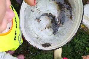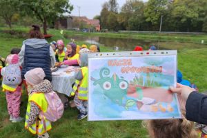 Spotkanie z żywą rybą wywołało wśród dzieci wielki zachwyt. Każde chętne dziecko miało możliwość dotknąć żywego karpia oraz poznać zasady hodowli ryb. Po ”dogłębnej”/niektórzy tak zgłębiali wiedzę, aż rękawy były mokre/ analizie budowy ryb udaliśmy się na ciepły i słodki poczęstunek przygotowany przez gospodarzy. Serdecznie dziękujemy rodzicom Antosi i Klary za miłe przyjęcie, poświęcony czas i wielkie serca