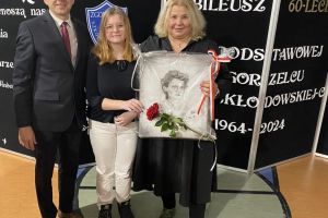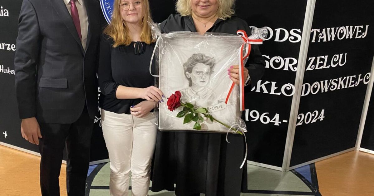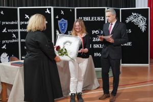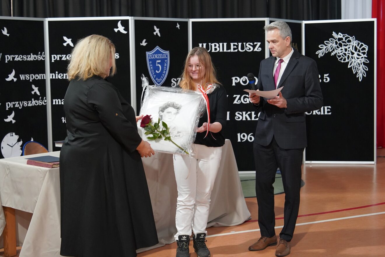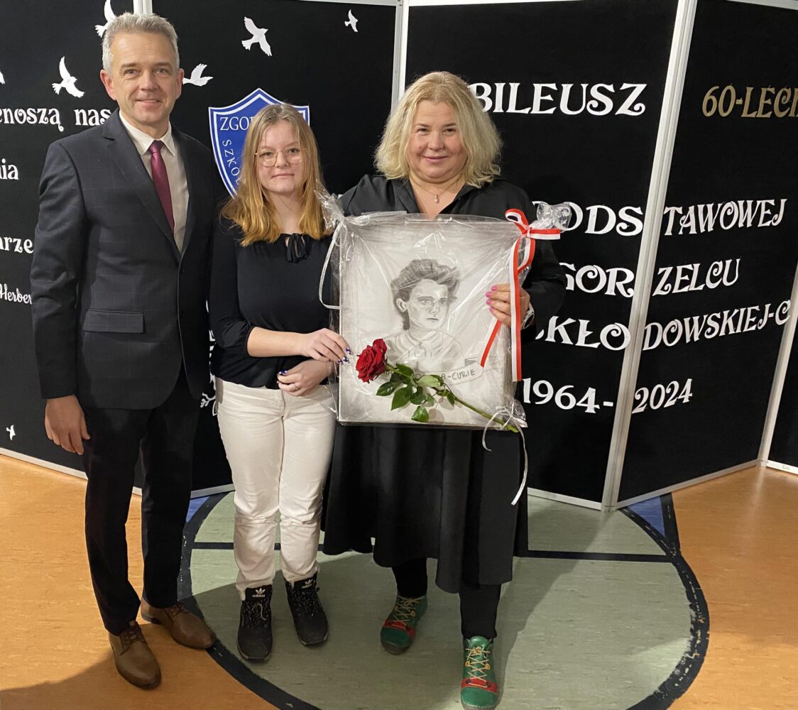 Tym razem wraz z dyrektorem Dariuszem Kołodziejczykiem na Jubileuszu 60-lecia Szkoły Podstawowej nr 5 im. Marii Skłodowskiej-Curie w Zgorzelcu. Podarowała swój obraz patronki szkoły Pani dyrektor Marlenie Dzierce.