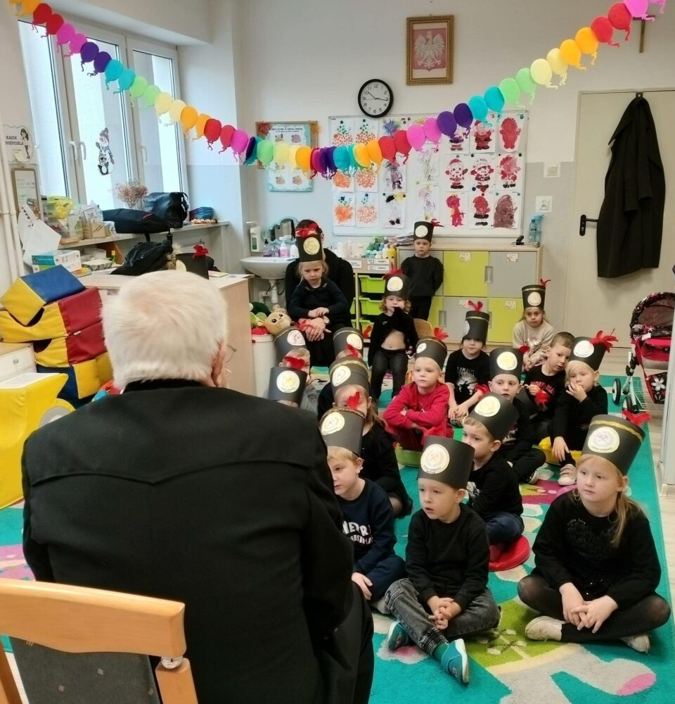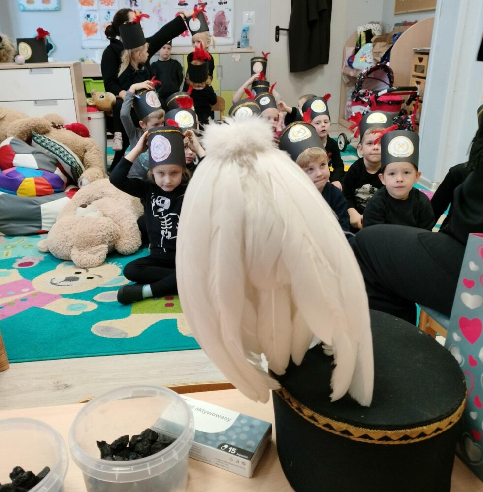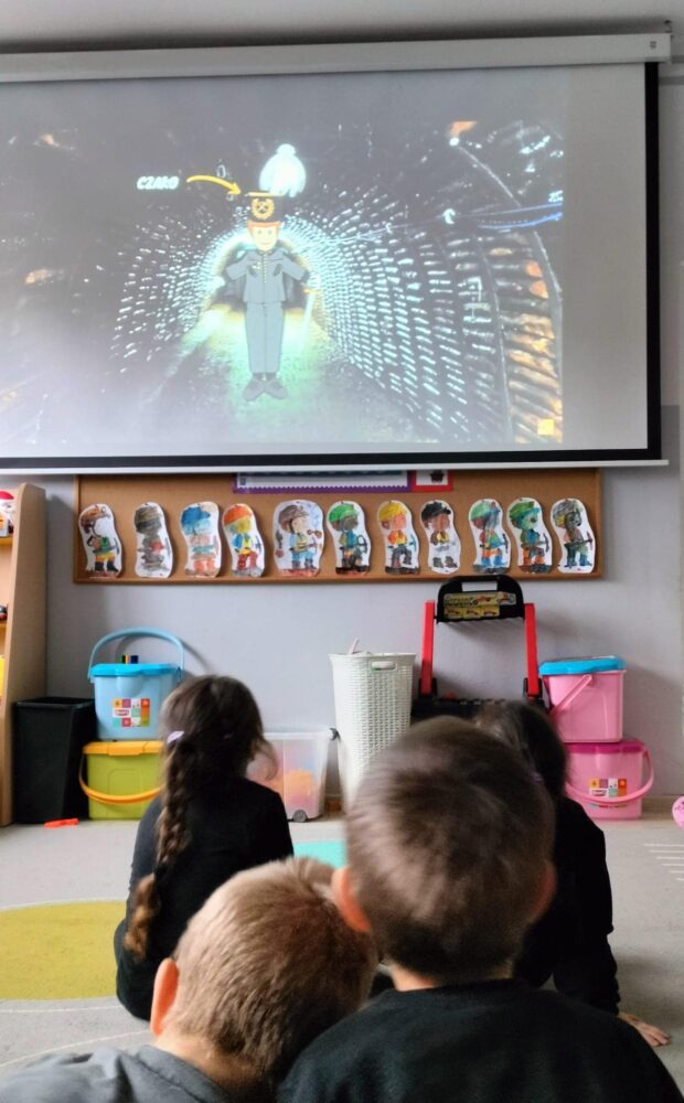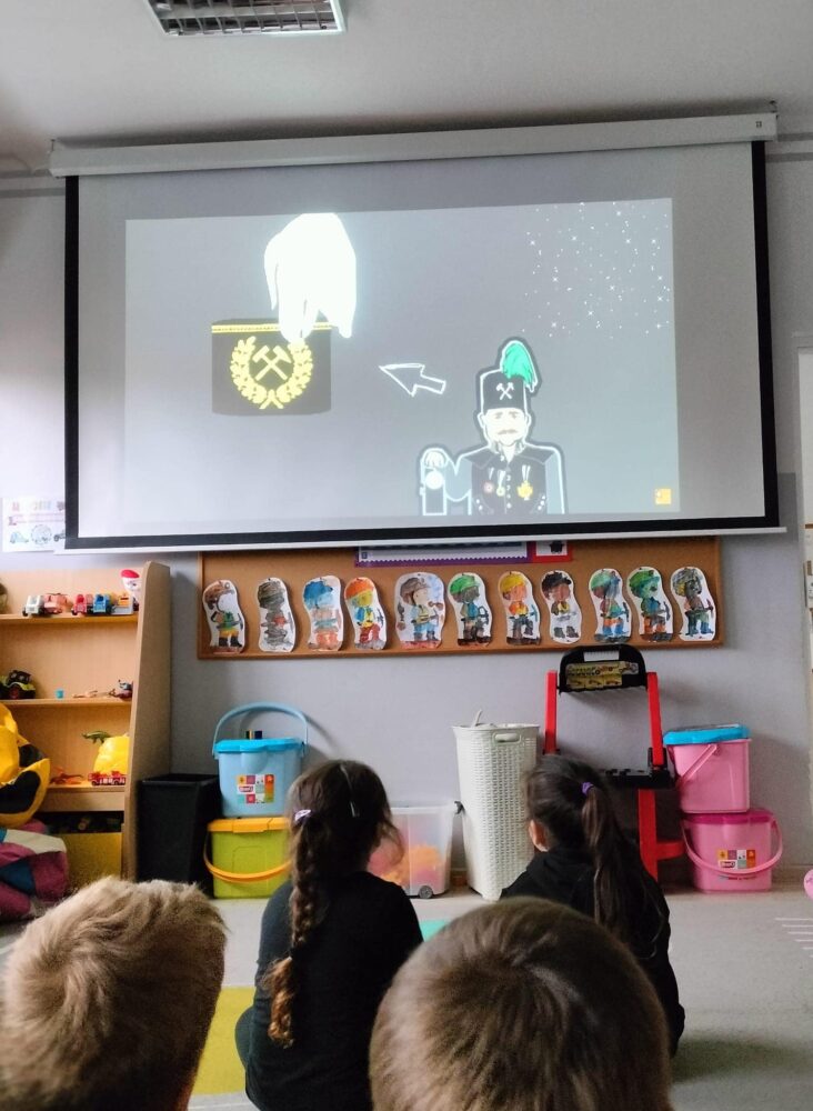 Przedszkolanki poznały powitanie górnicze słowami „Szczęść Boże”. Maluszki mogły zobaczyć strój galowy górnika oraz czako – galową czapkę. Czapki występują w różnych kolorach pióropuszy: zielonym/kadra kierownicza/, białym/inżynierowie/ czarnym/górnicy pracujący pod ziemią/ i czerwonym/górnicza orkiestra/. Dużym zainteresowaniem cieszył się sznur orderów przypiętych do munduru górnika oraz sam węgiel, który dzieci mogły dotknąć i powąchać. Przedszkolaki pożegnały miłego gościa odśpiewaniem tradycyjnego ”100 lat”’