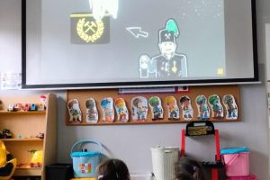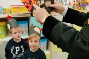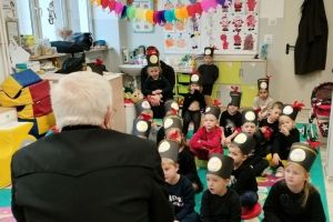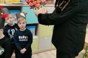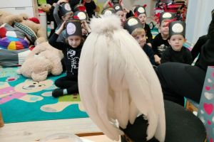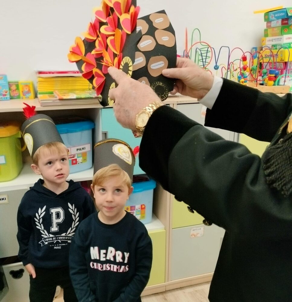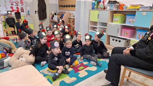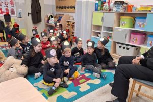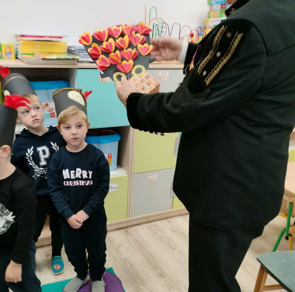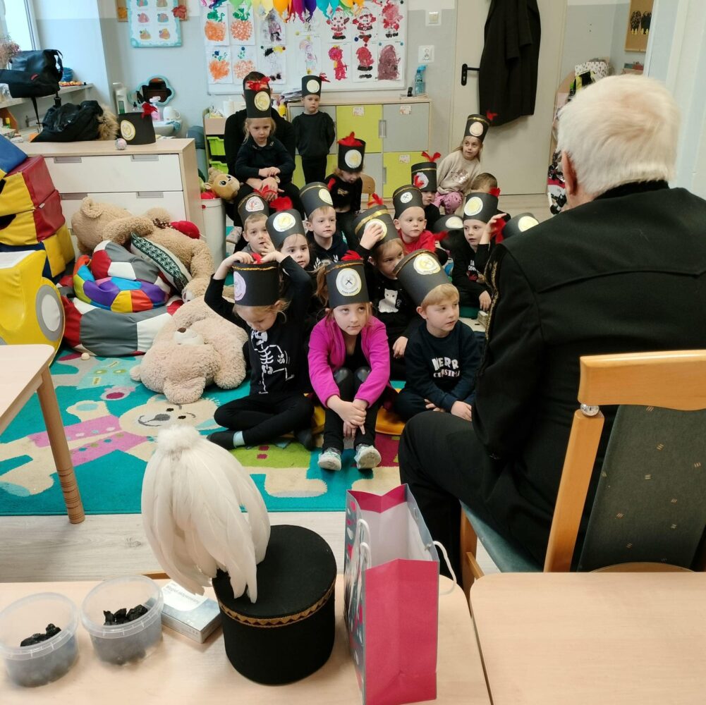 Przedszkolanki poznały powitanie górnicze słowami „Szczęść Boże”. Maluszki mogły zobaczyć strój galowy górnika oraz czako – galową czapkę. Czapki występują w różnych kolorach pióropuszy: zielonym/kadra kierownicza/, białym/inżynierowie/ czarnym/górnicy pracujący pod ziemią/ i czerwonym/górnicza orkiestra/. Dużym zainteresowaniem cieszył się sznur orderów przypiętych do munduru górnika oraz sam węgiel, który dzieci mogły dotknąć i powąchać. Przedszkolaki pożegnały miłego gościa odśpiewaniem tradycyjnego ”100 lat”’