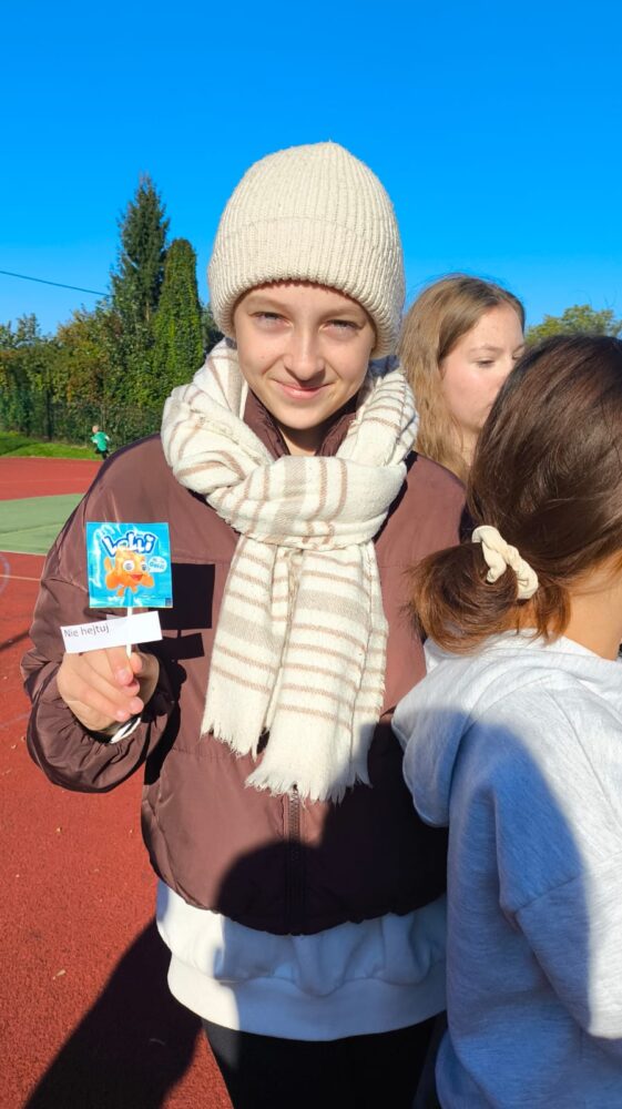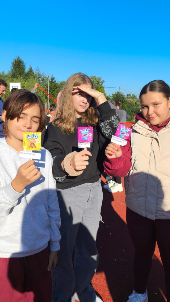 W tym tygodniu nauczyciele i specjaliści szkolni przeprowadzili w klasach zajęcia warsztatowe oraz pogadanki na temat tego, jak budować pozytywne relacje, jak reagować gdy widzimy problem hejtu czy innych form przemocy. Uczniowie bardzo aktywnie uczestniczyli w warsztatach, podczas których doskonalili umiejętność współpracy w zespole. Wykonali również piękne plakaty o tematyce przeciwdziałania przemocy. Słodkim akcentem dla każdego był lizak zawierający „złotą myśl – wskazówkę” jak budować pozytywne relacje międzyludzkie.