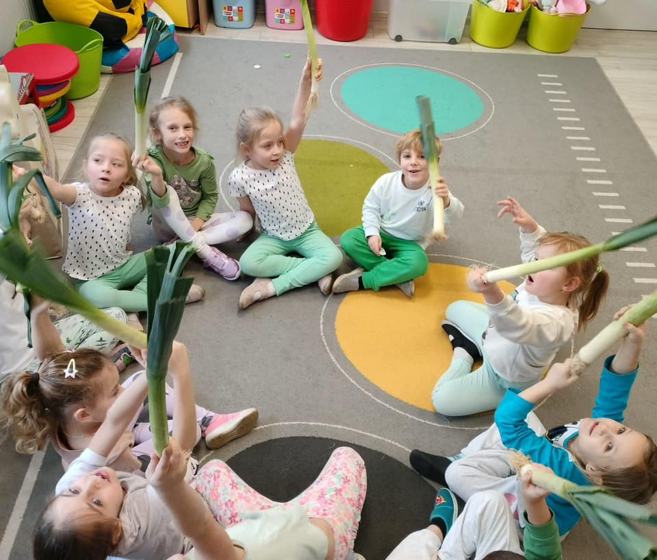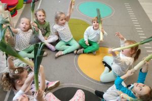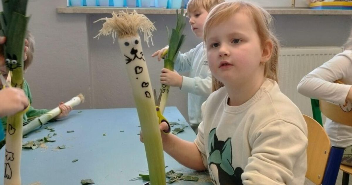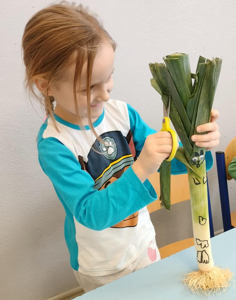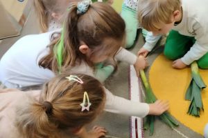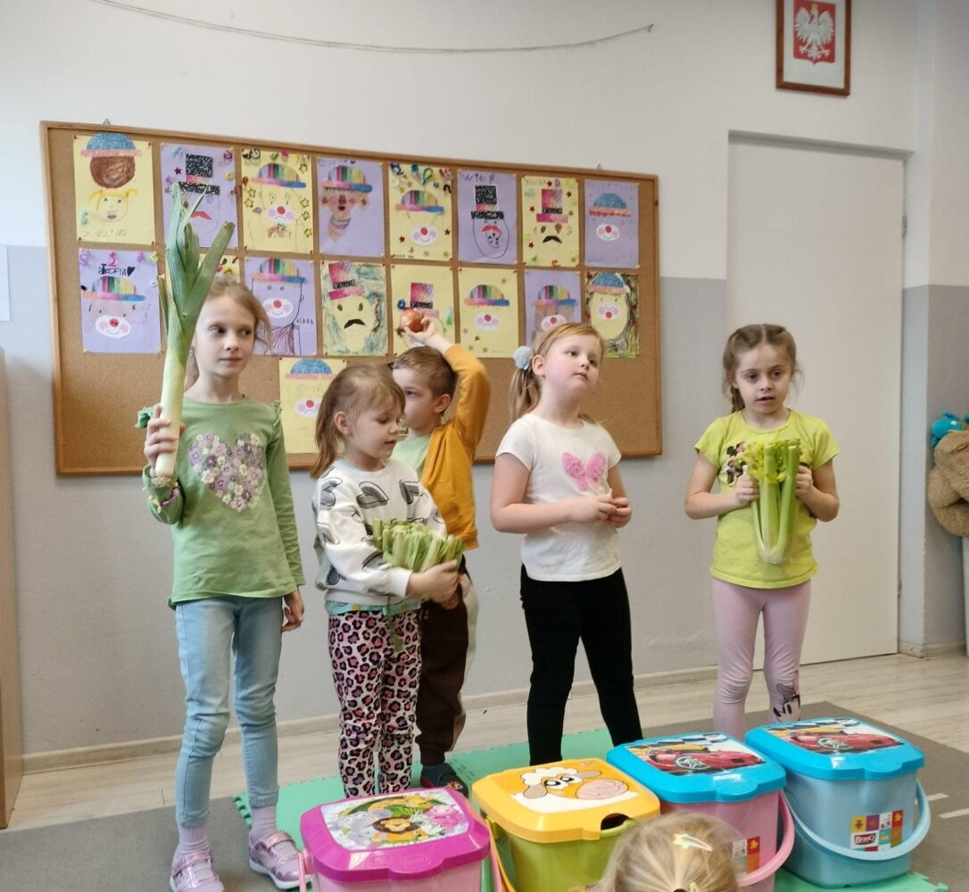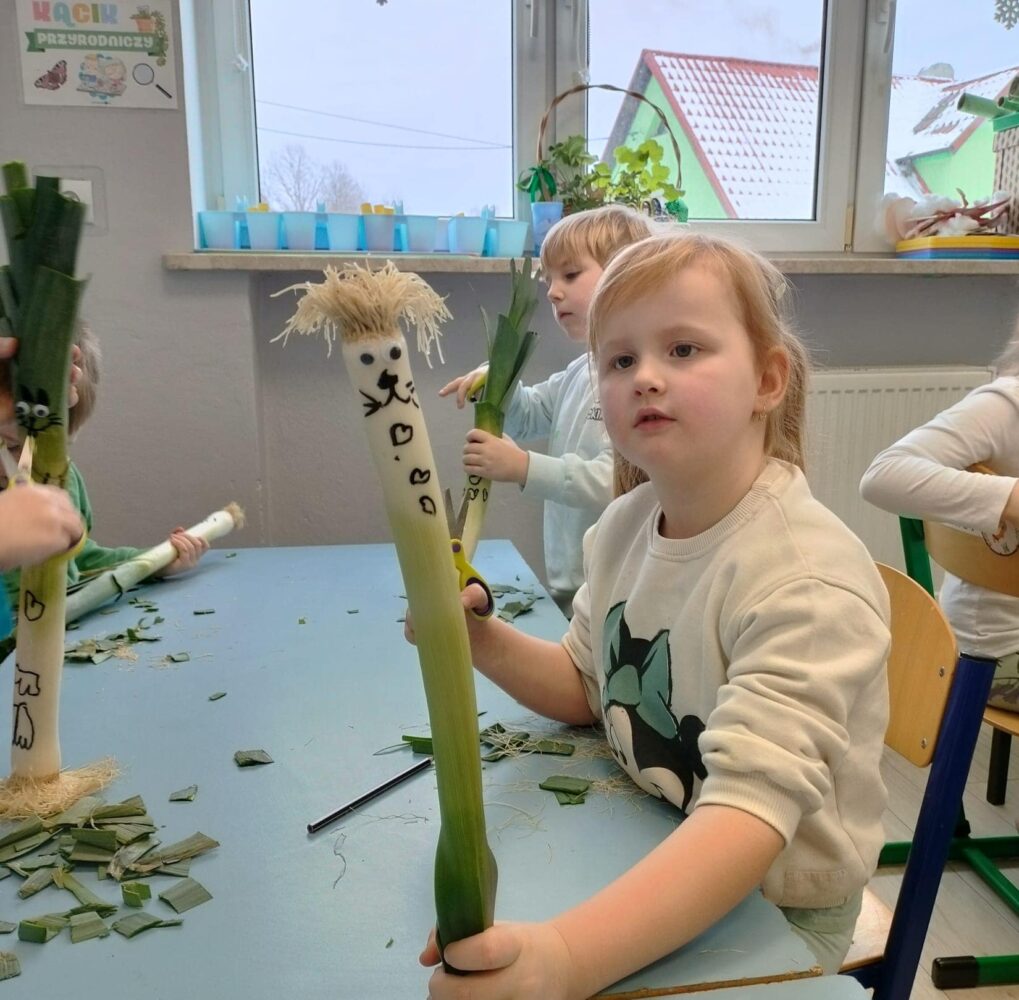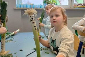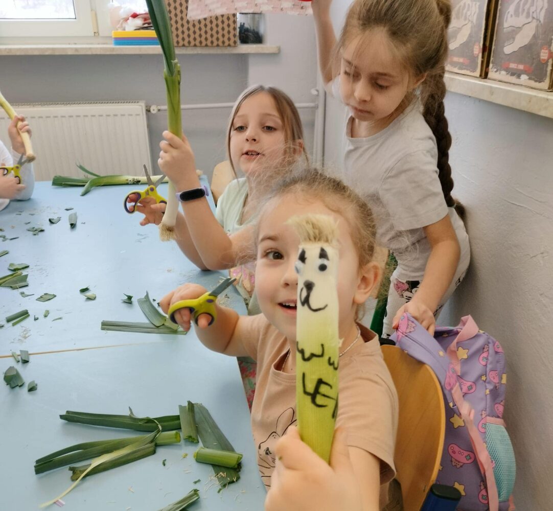 Aktywności, które w tym dniu czekały na dzieci to m. in. malowanie liśćmi pora, wykonanie pora z bibuły, mierzenie warzyw, zabawy przy piosence, gimnastyka, teatrzyk warzywny i to co podobało się najbardziej – por u fryzjera.