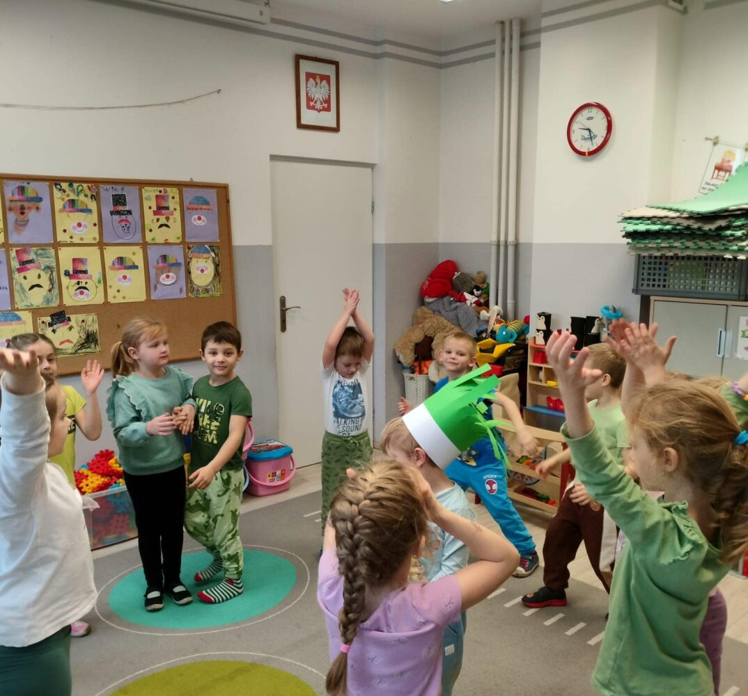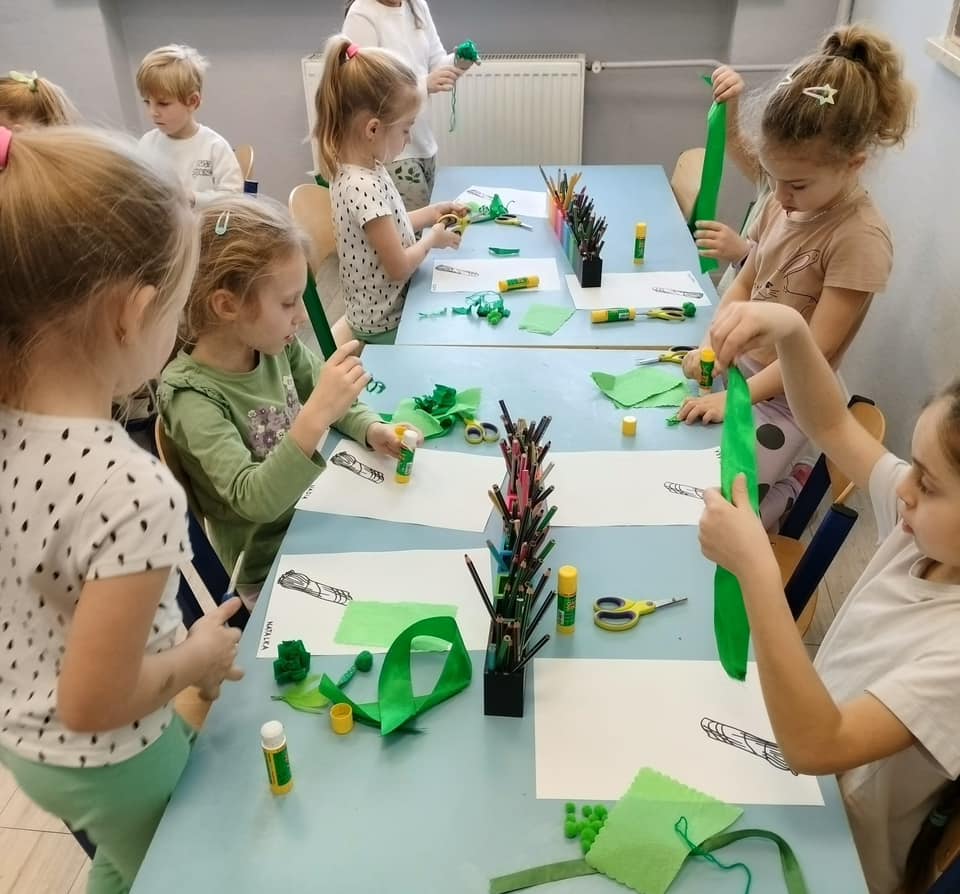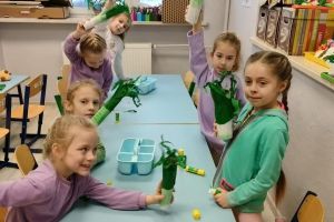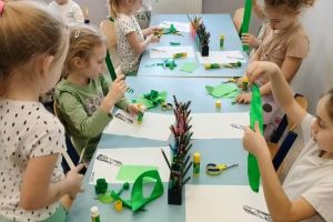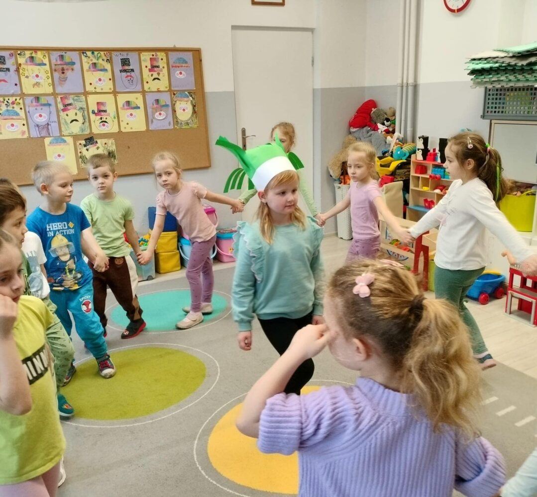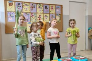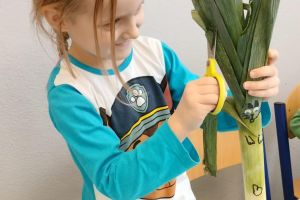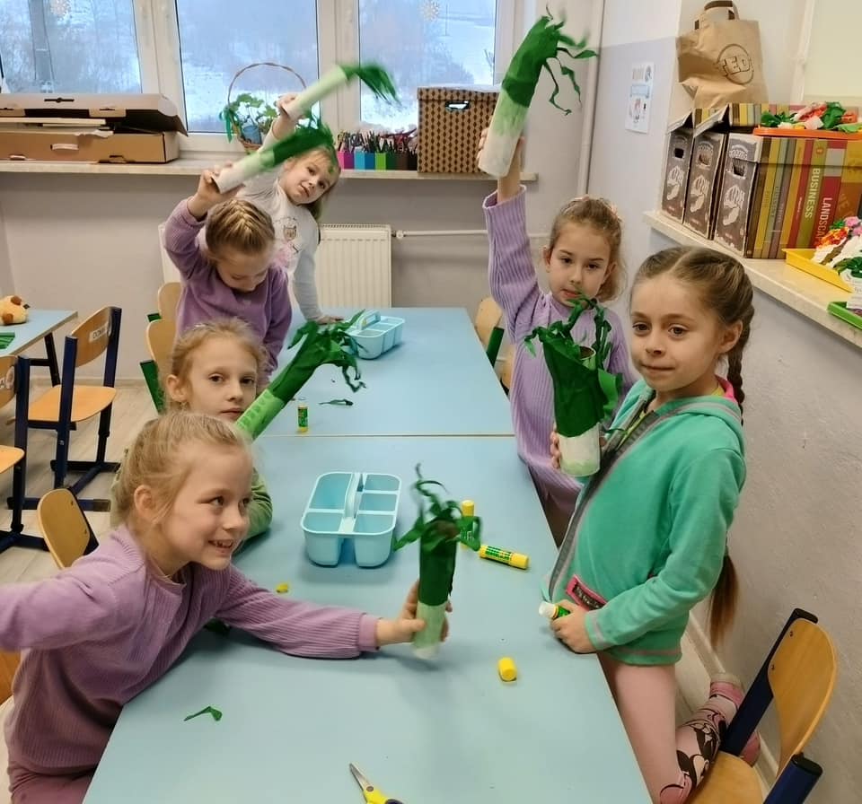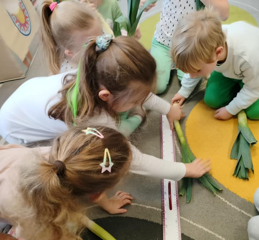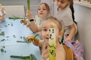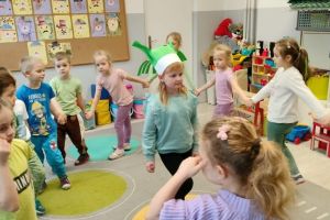 Aktywności, które w tym dniu czekały na dzieci to m. in. malowanie liśćmi pora, wykonanie pora z bibuły, mierzenie warzyw, zabawy przy piosence, gimnastyka, teatrzyk warzywny i to co podobało się najbardziej – por u fryzjera.